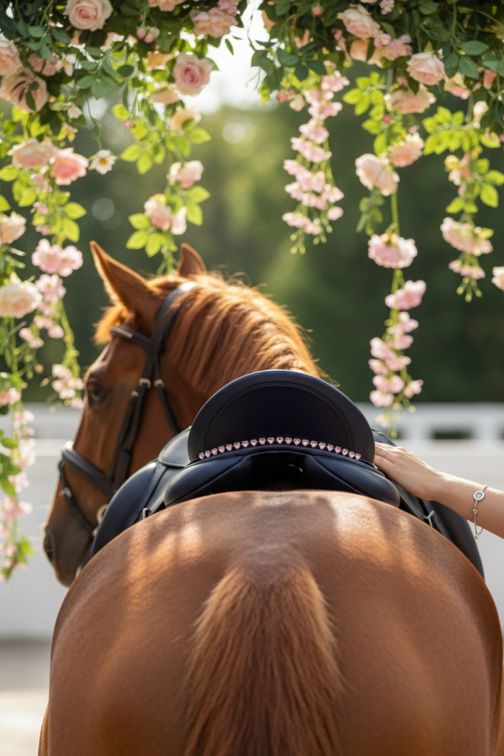 Der Sattelschmuck Rose Hearts präsentiert sich mit rose Herzen, die an rosane Rosen erinnern. Diese dekorativen Elemente verleihen dem Sattel ein frisches, sommerliches Erscheinungsbild. Die funkelnden Steine reflektieren das Sonnenlicht, was nicht nur ästhetisch ansprechend ist, sondern auch die Sichtbarkeit erhöht.