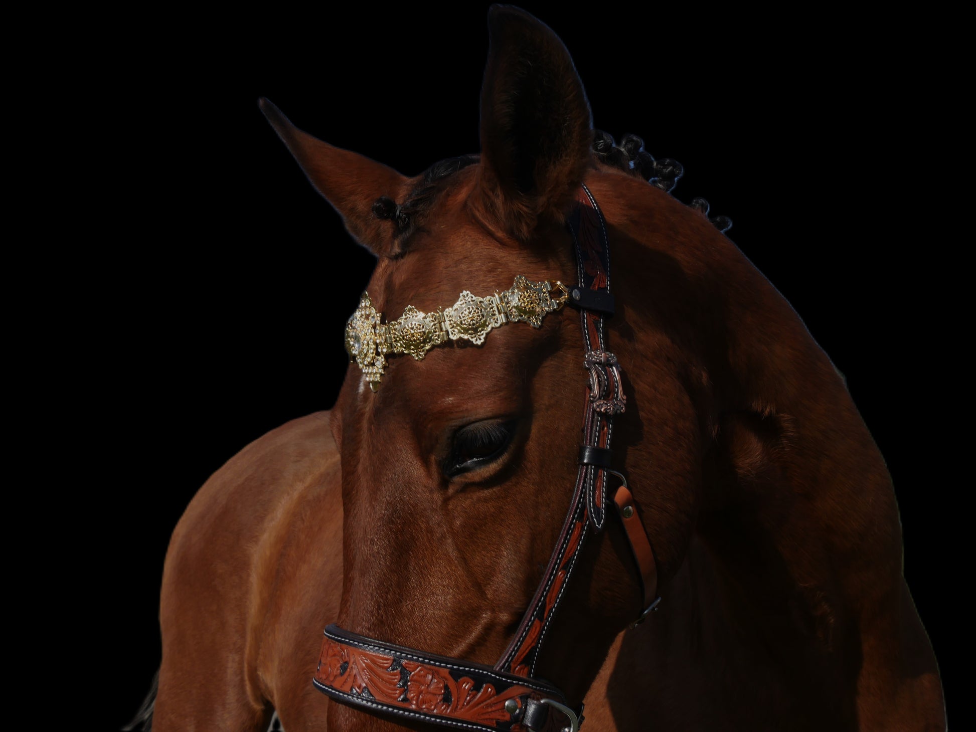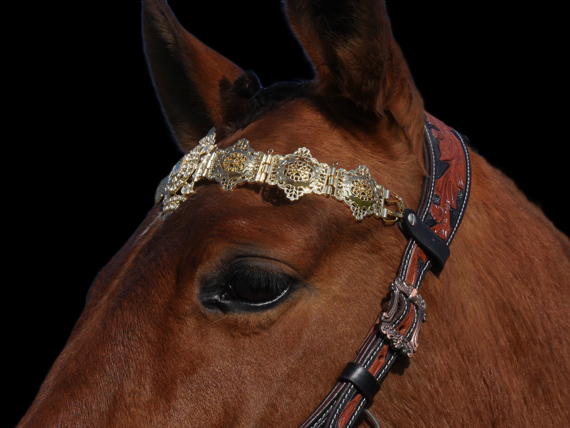 Der orientalische Stirnriemen „Orient“ verleiht deinem Pferd mit seinem goldenen Muster einen zauberhaften Look – perfekt fürs Showreiten, Fotoshootings und besondere Auftritte. Er kombiniert stilvolle Eleganz mit einem Hauch von Exotik und macht jedes Pferdeoutfit zum Hingucker. Ein echtes Highlight für alle, die ihrem Pferd das gewisse Etwas schenken wollen!