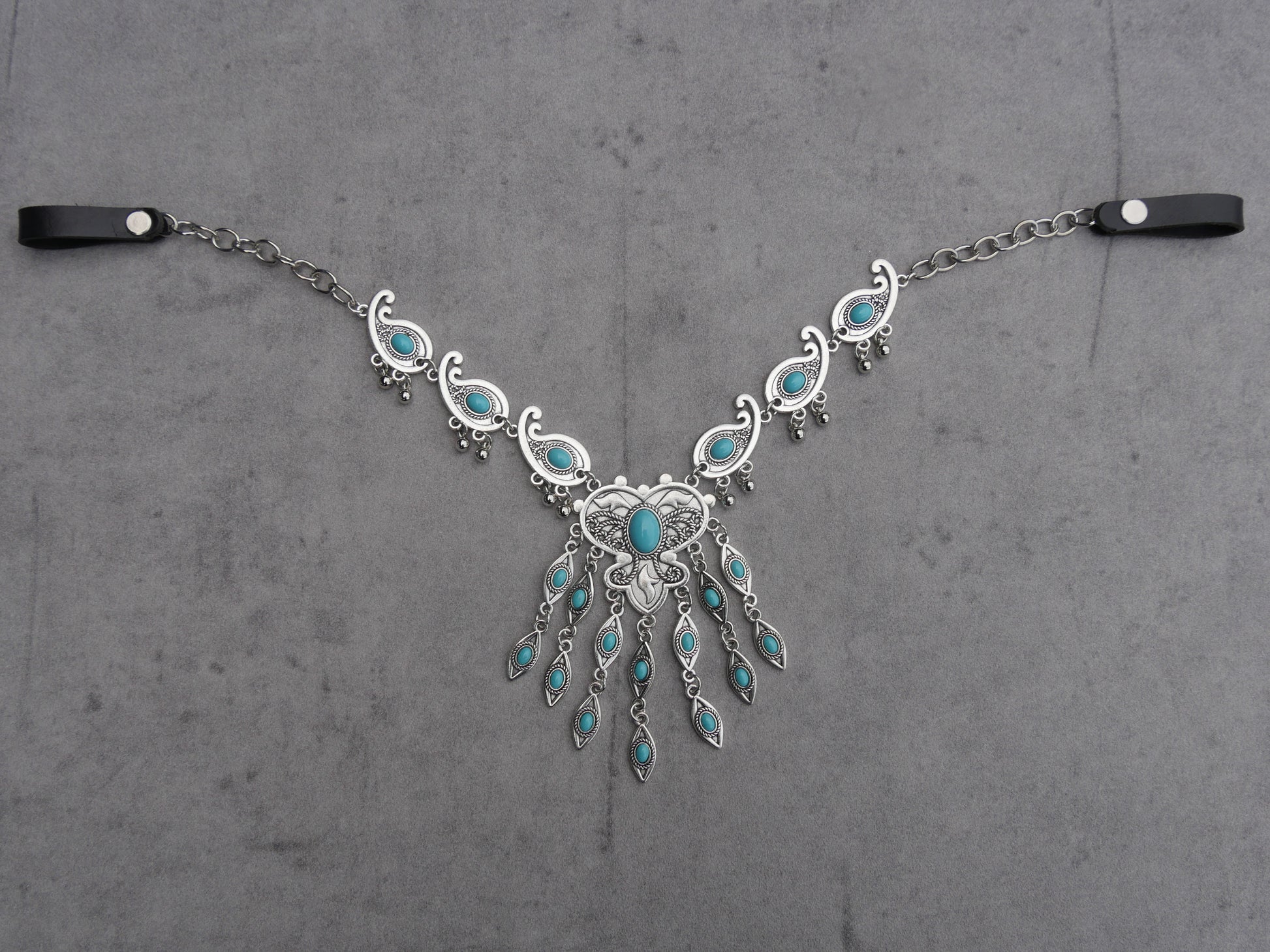 Verleihe deinem Fotoshooting mit unserem keltischen Pferdeschmuck in Silber und Türkis einen magischen Touch! Dieses verspielte Accessoire verbindet traditionelle keltische Muster mit lebendigen Farben und sorgt dafür, dass dein Pferd im Rampenlicht glänzt. Perfekt, um besondere Momente stilvoll und einzigartig festzuhalten.