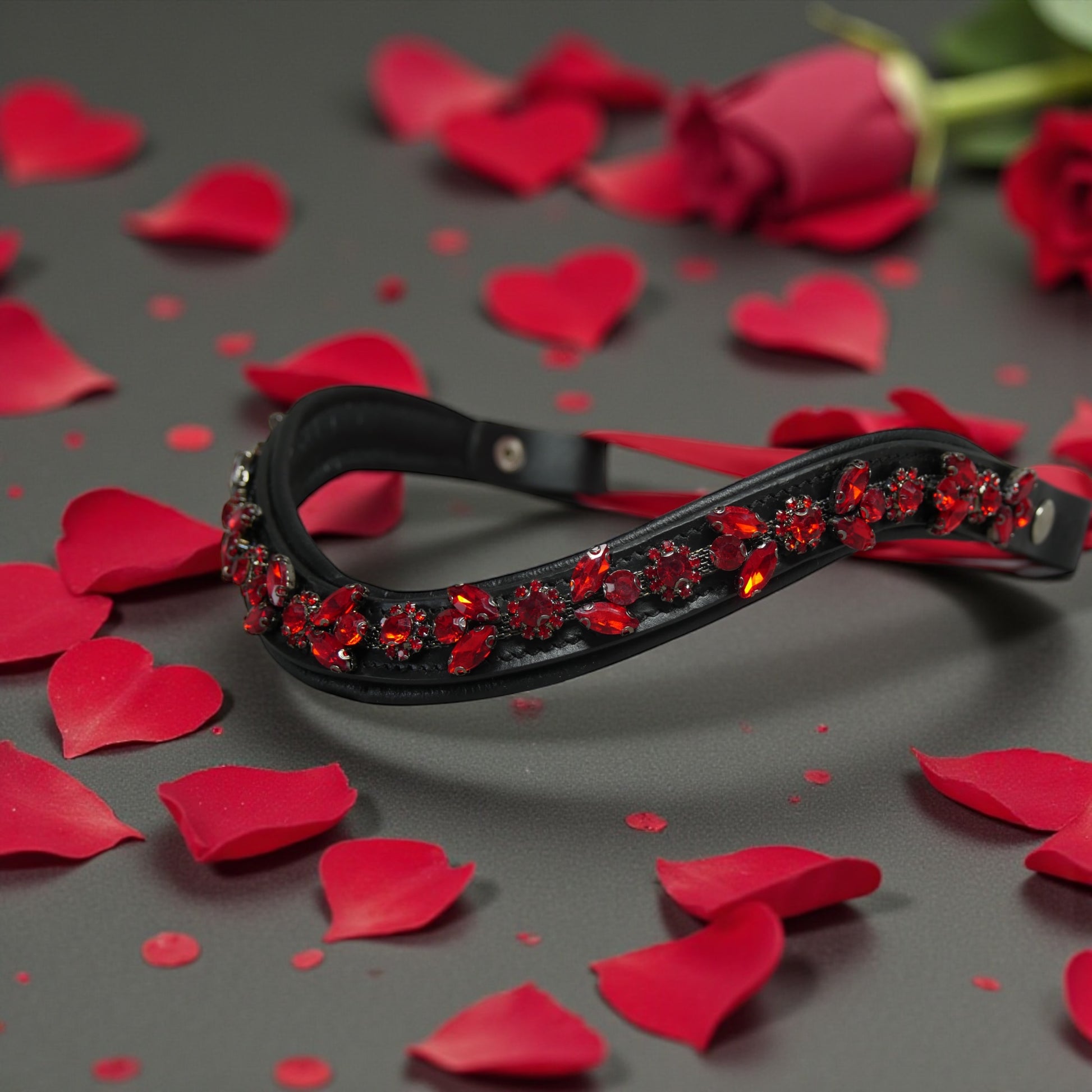 Verleihen Sie Ihrem Pferd einen glamourösen Auftritt mit unserem roten Stirnriemen "Amore". Die funkelnden Glitzerelemente setzen bezaubernde Akzente, während der praktische Schnellverschluss für mühelose Handhabung sorgt. Ein unverzichtbares Accessoire für stilbewusste Reiter, die Wert auf Eleganz und Funktionalität legen.