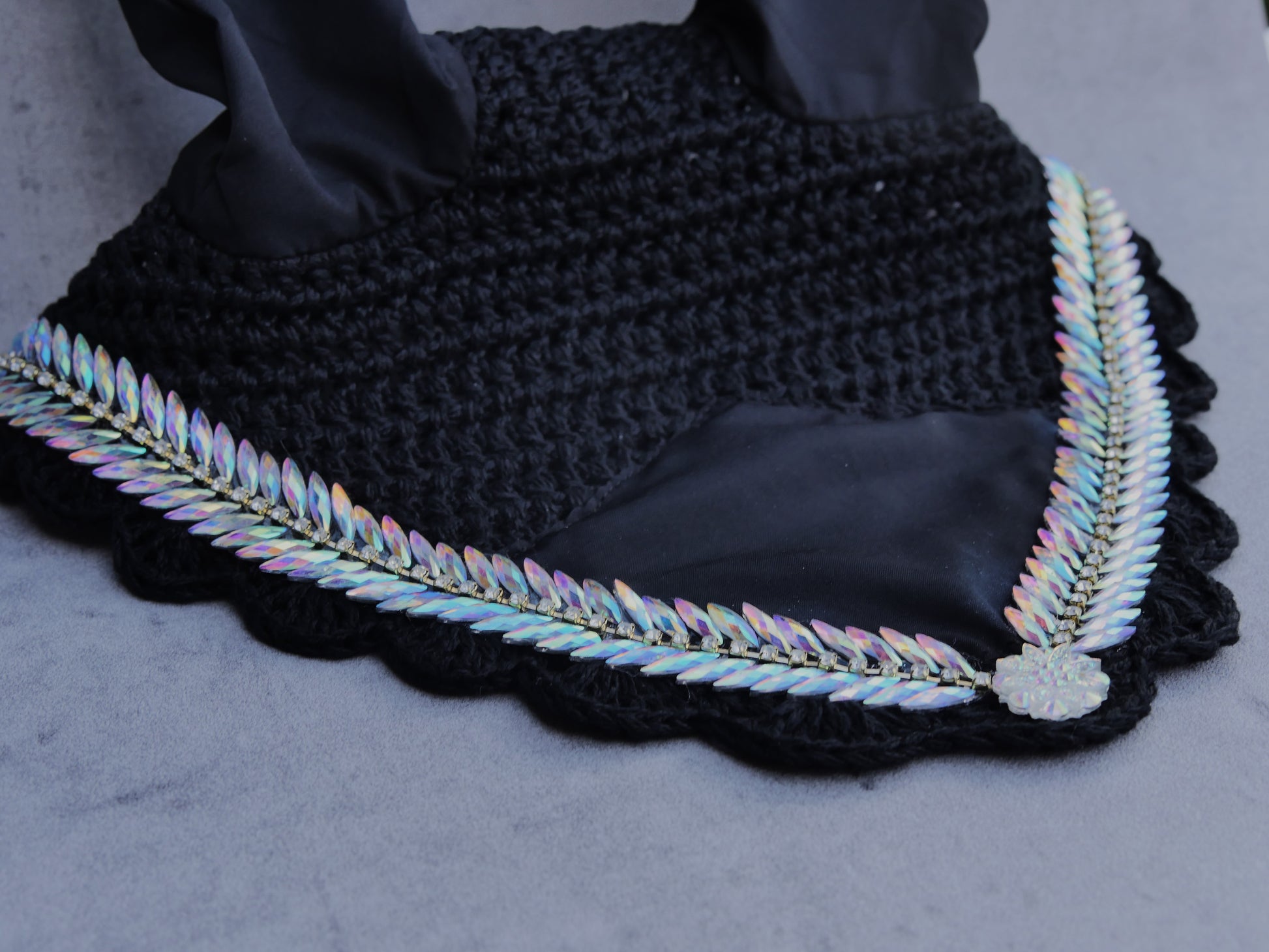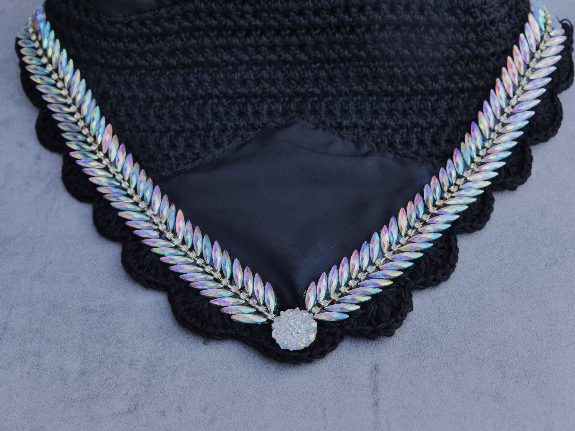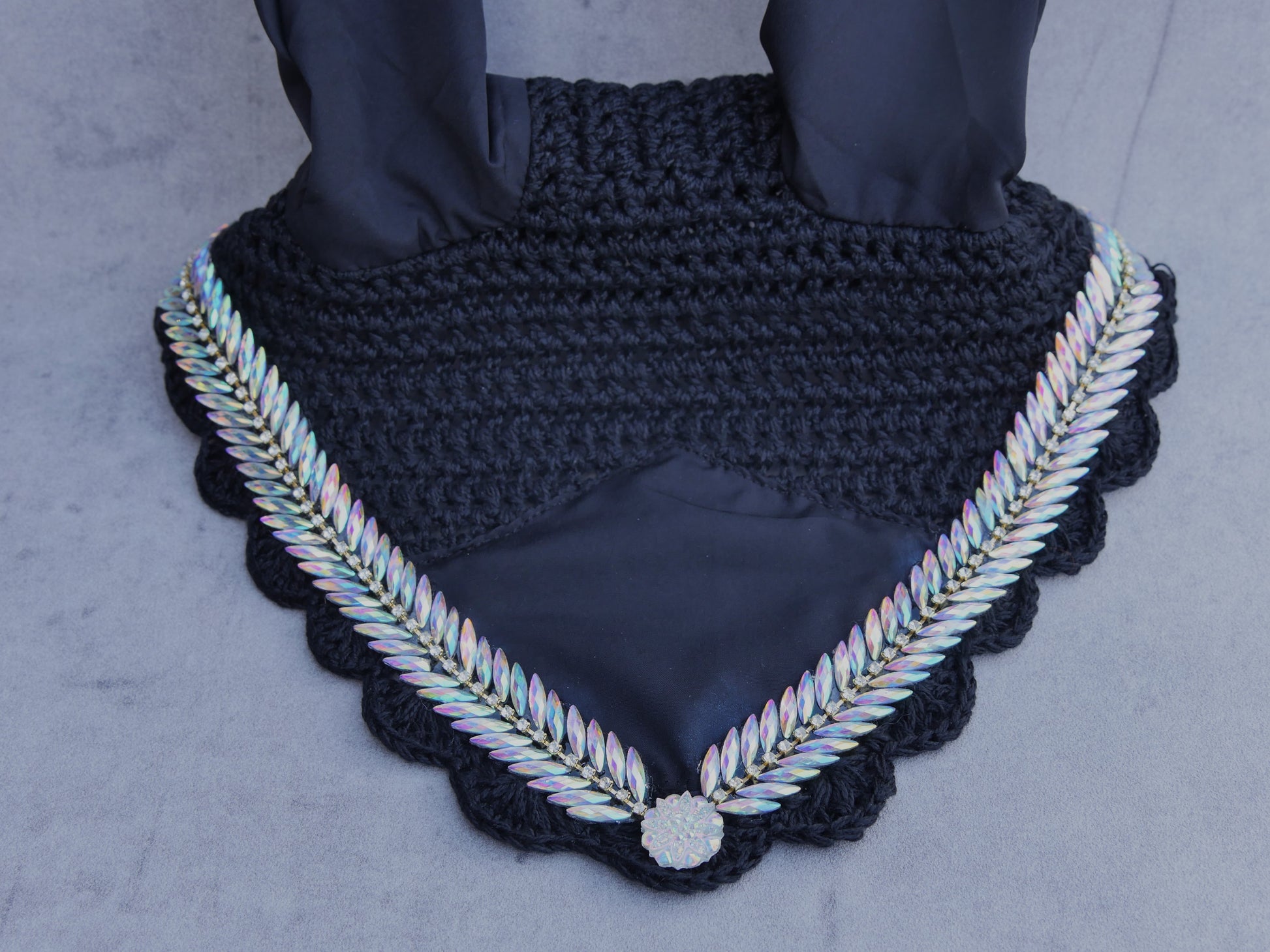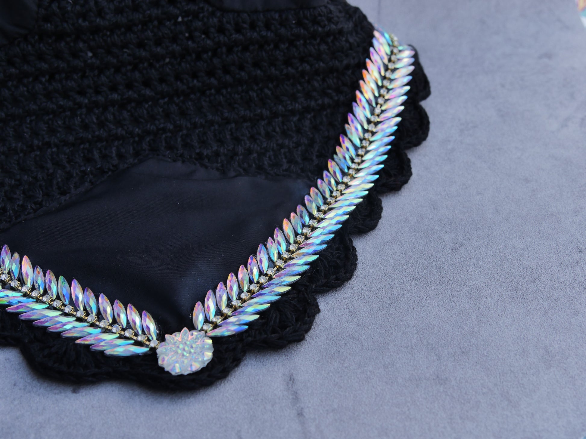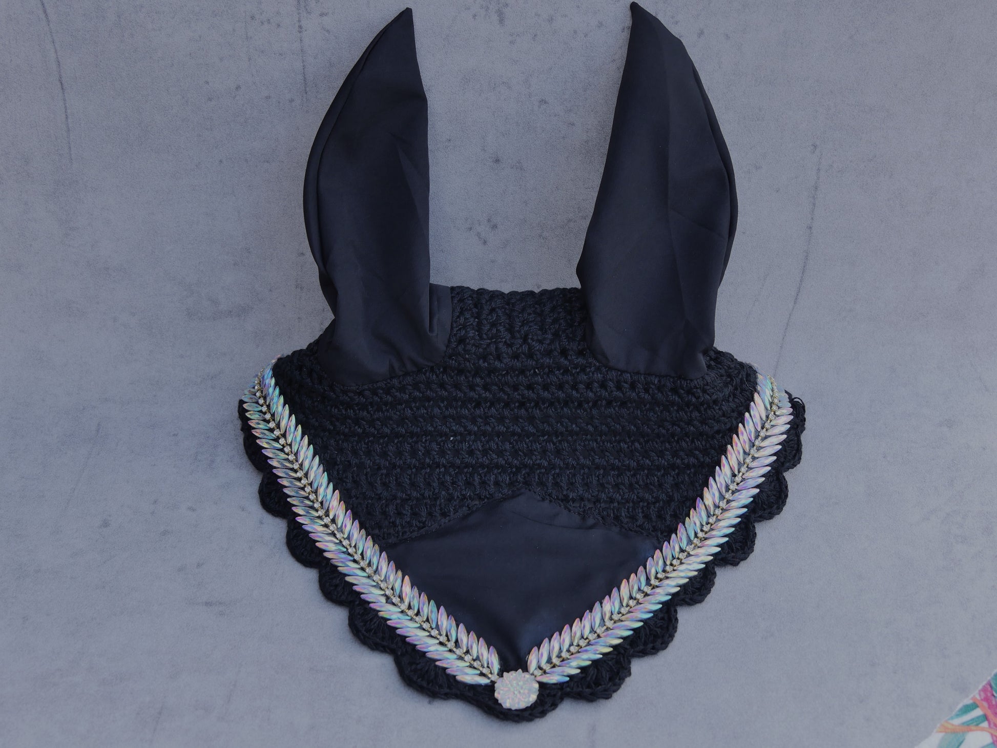 Entdecke die Fliegenohren Holographic – eine schwarze Fliegenhaube mit einem funkelnden holografischen Band am Rand. Teil der federleichten Feather Light Kollektion, sorgt sie für stylischen Schutz vor Fliegen. Kombiniere sie mit dem passenden holografischen Stirnriemen für einen coolen, schimmernden Look!
