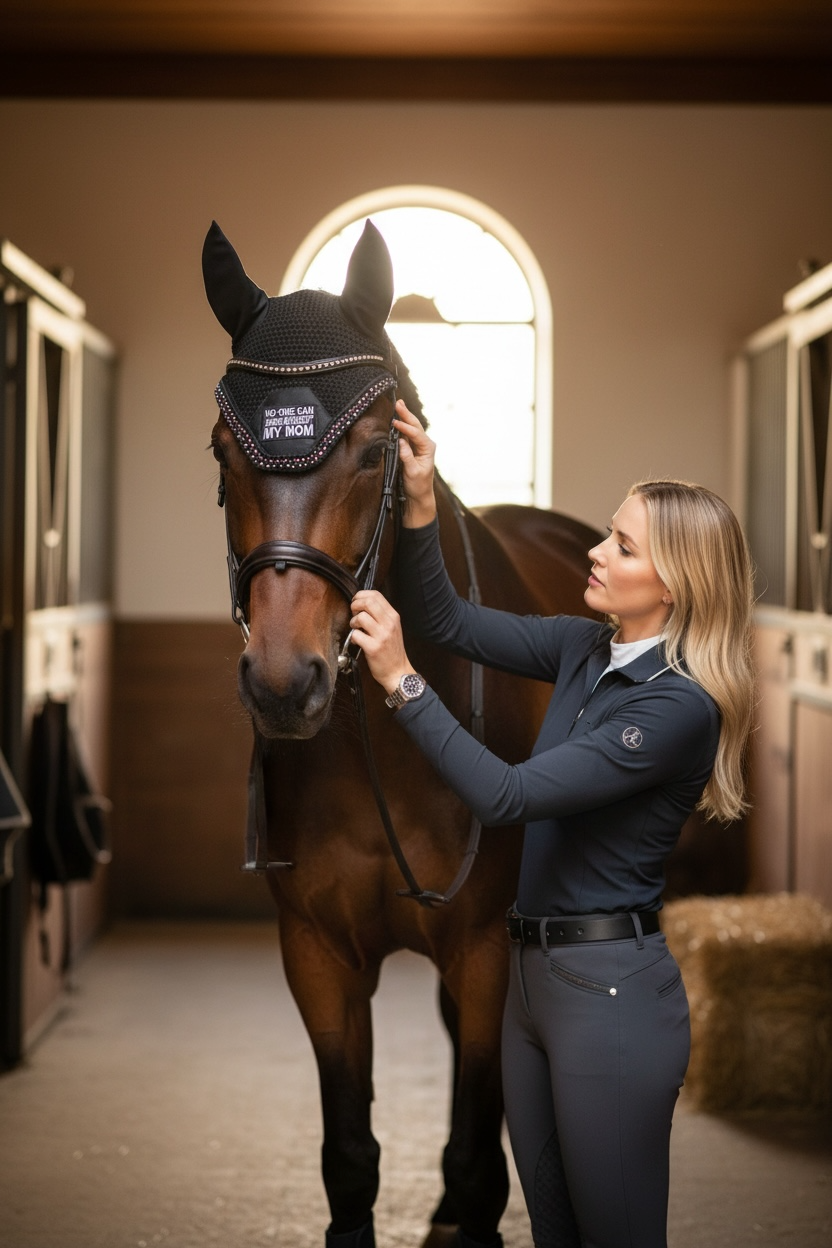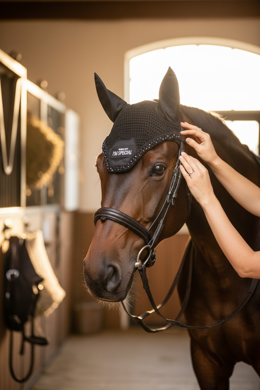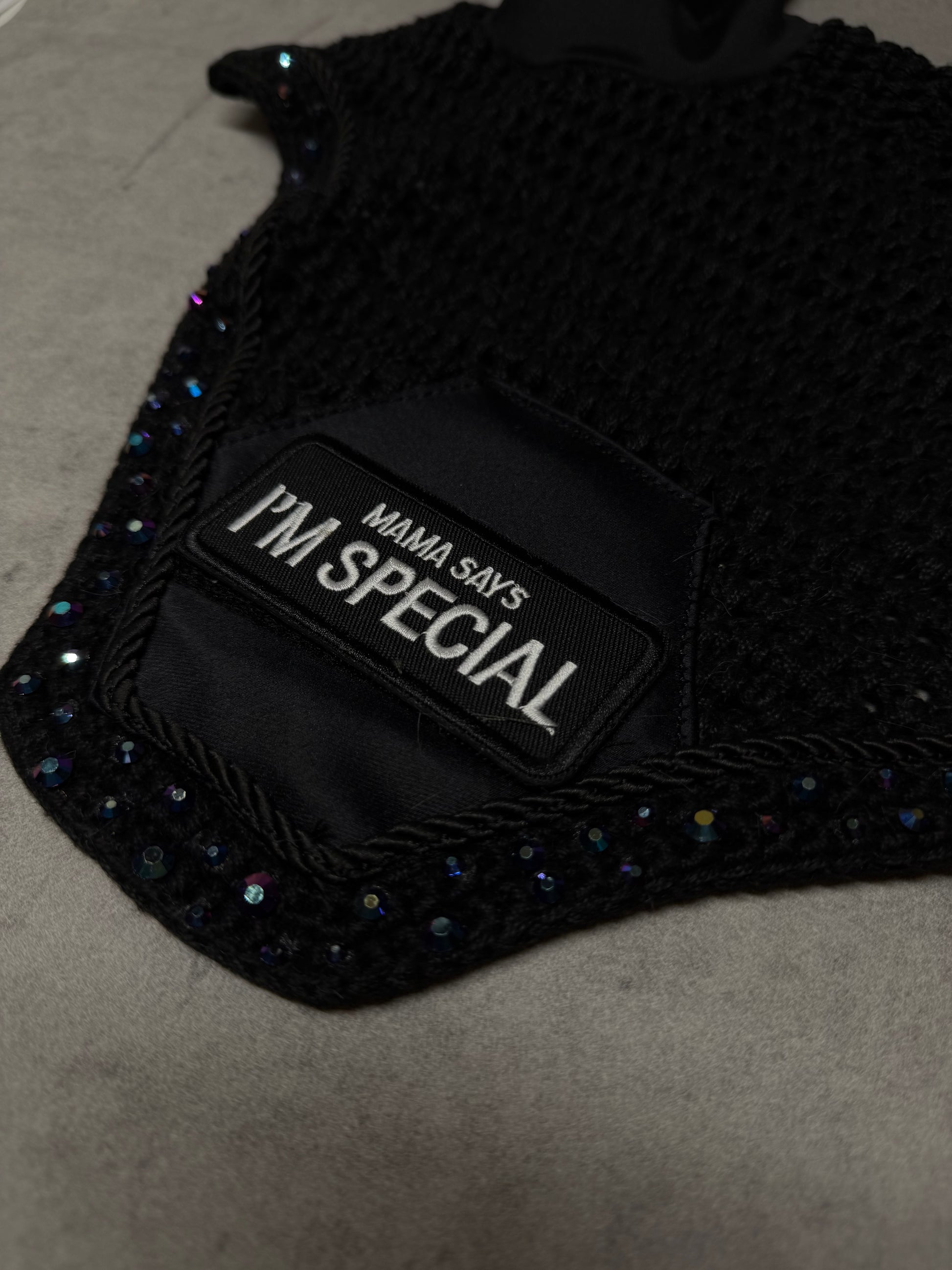 Reite ganz ohne Sorgen mit der Fliegenhaube 'Mama says I'm special'! Schütze dein Pferd vor lästigen Fliegen und zeige gleichzeitig deinen Spaß an Humor. Perfekt für besondere Pferde und deren humorvolle Besitzer. Einfach aufsetzen und Spaß haben!