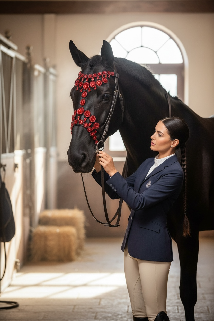 Verzaubern Sie mit unserem Pferdekopfschmuck StarLuxe Róuge! Für unvergessliche Auftritte bei Pferdeshows, Videodrehs und um den perfekten Moment festzuhalten.