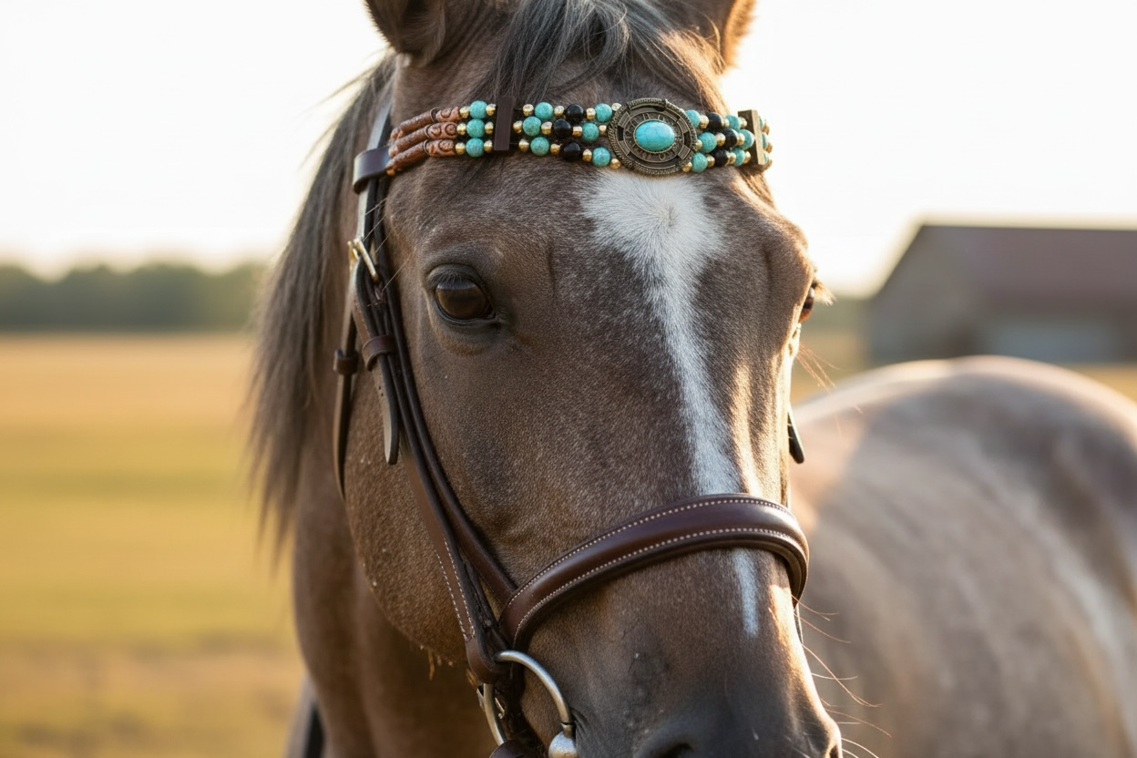 Verleihen Sie Ihrem Pferd mit dem Pferdeschmuck Wild West einen stilvollen Wildwest-Look. Der hochwertige western Stirnriemen sorgt für eine ansprechende Optik und lässt sich leicht anpassen. Ideal für Turniere oder Freizeit, fördert er den individuellen Ausdruck Ihres Pferdes.