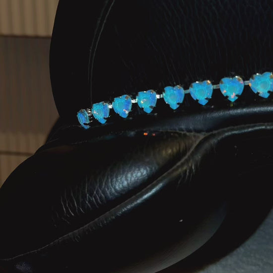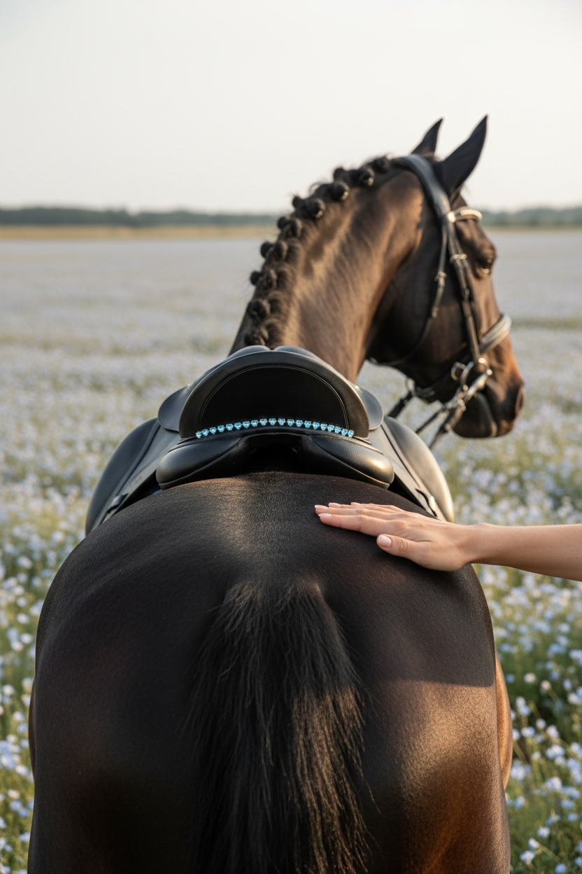 Der Sattelschmuck Santorini präsentiert sich mit hellblauen Herzen, die an die Küsten von Santorini erinnern. Diese dekorativen Elemente verleihen dem Sattel ein frisches, sommerliches Erscheinungsbild. Die funkelnden Steine reflektieren das Sonnenlicht, was nicht nur ästhetisch ansprechend ist, sondern auch die Sichtbarkeit erhöht.