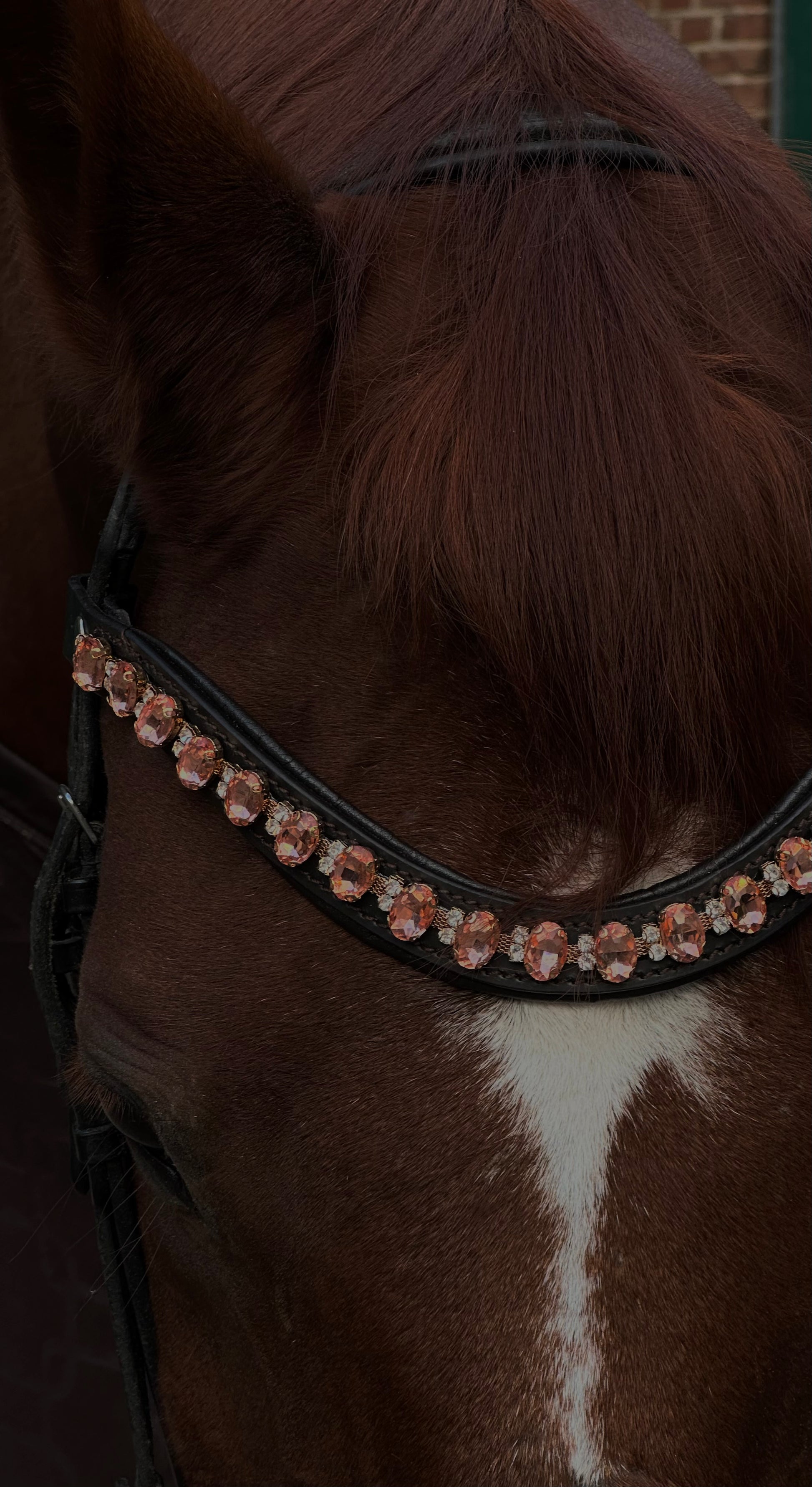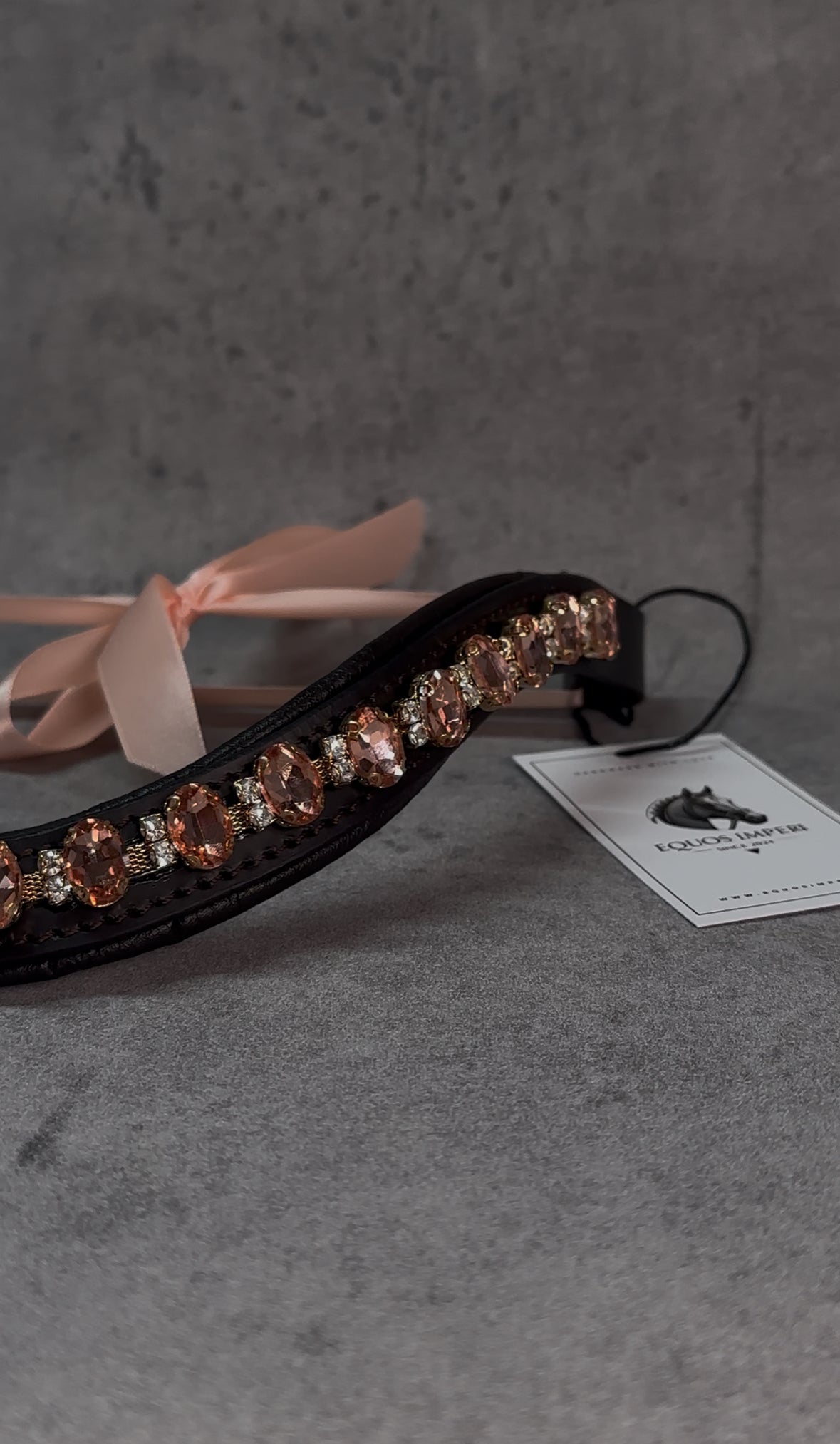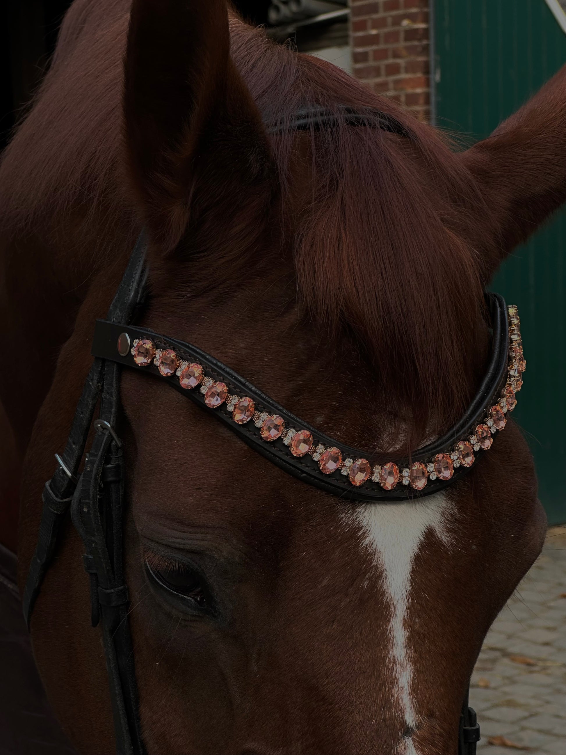 Der Stirnriemen Apricot (hier mit braunem Leder auf den Bildern) begeistert mit seinem strahlenden apricosen Farbenden und filigranen Strasssteinen, die im Licht elegant funkeln. Dank des praktischen Schnellverschlusses sitzt er immer perfekt und lässt sich im Handumdrehen anlegen – so spielst du stilvoll mit deinem Look!