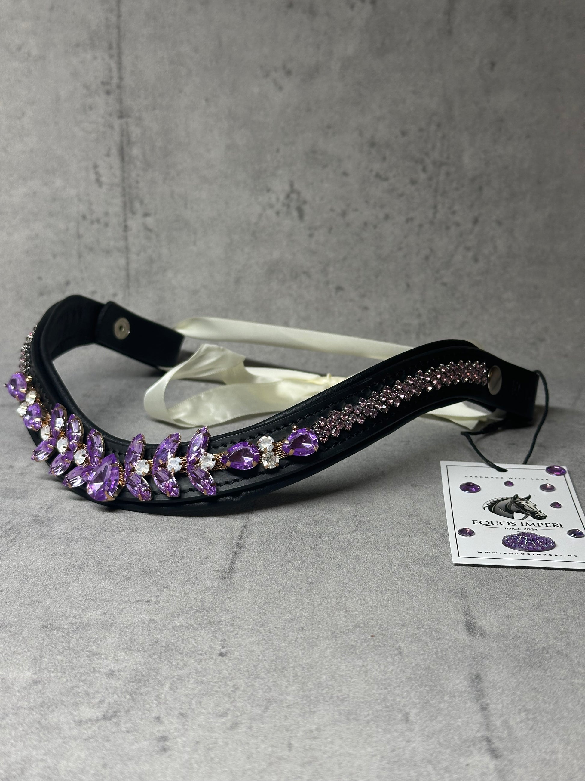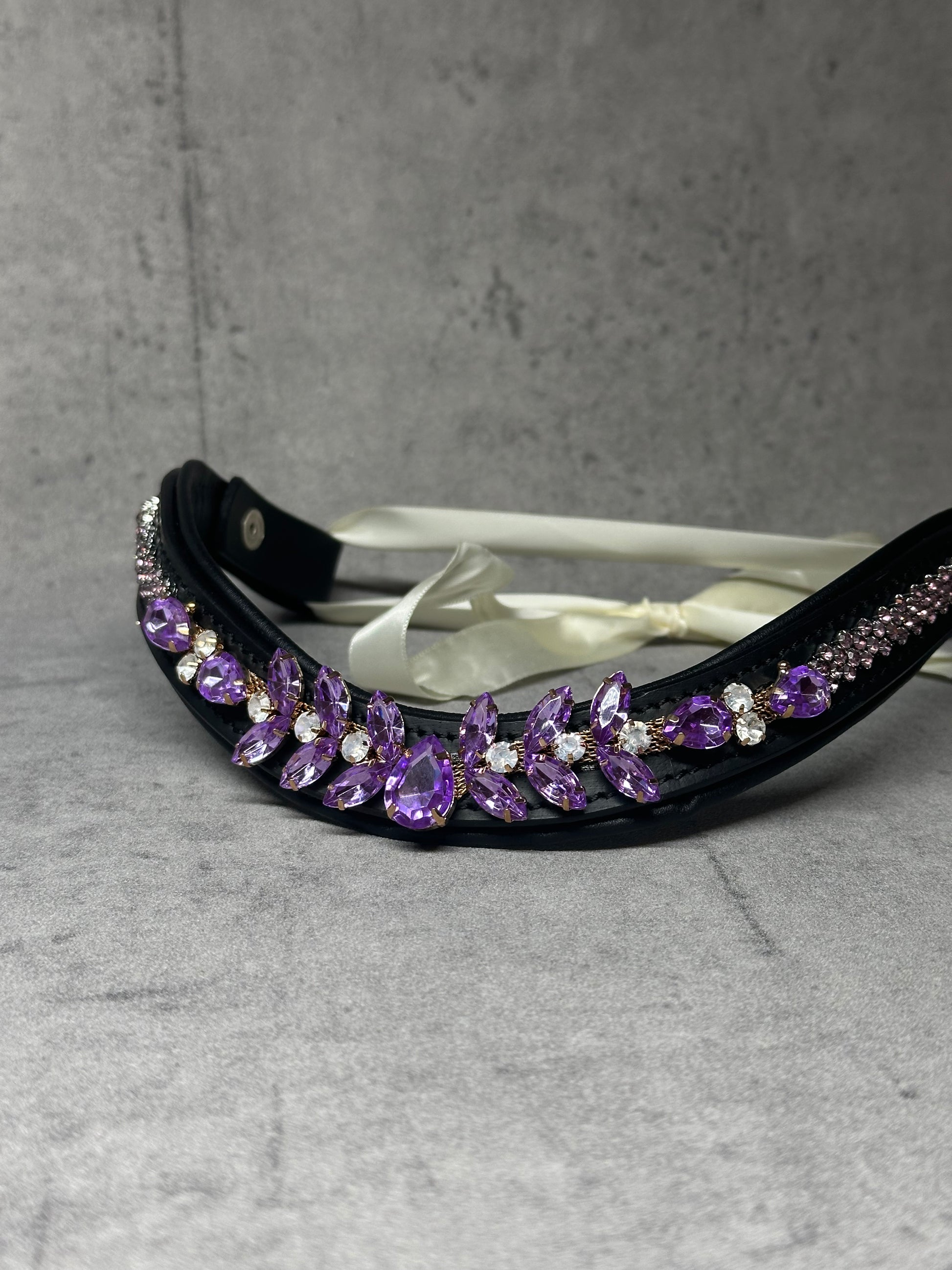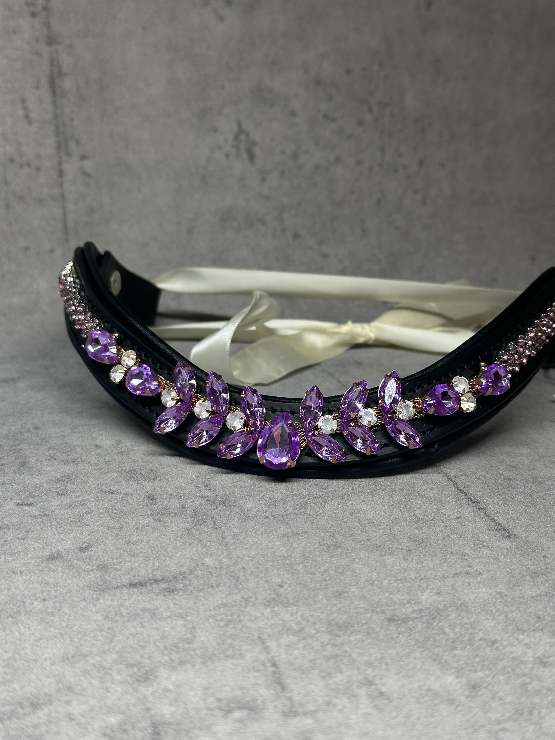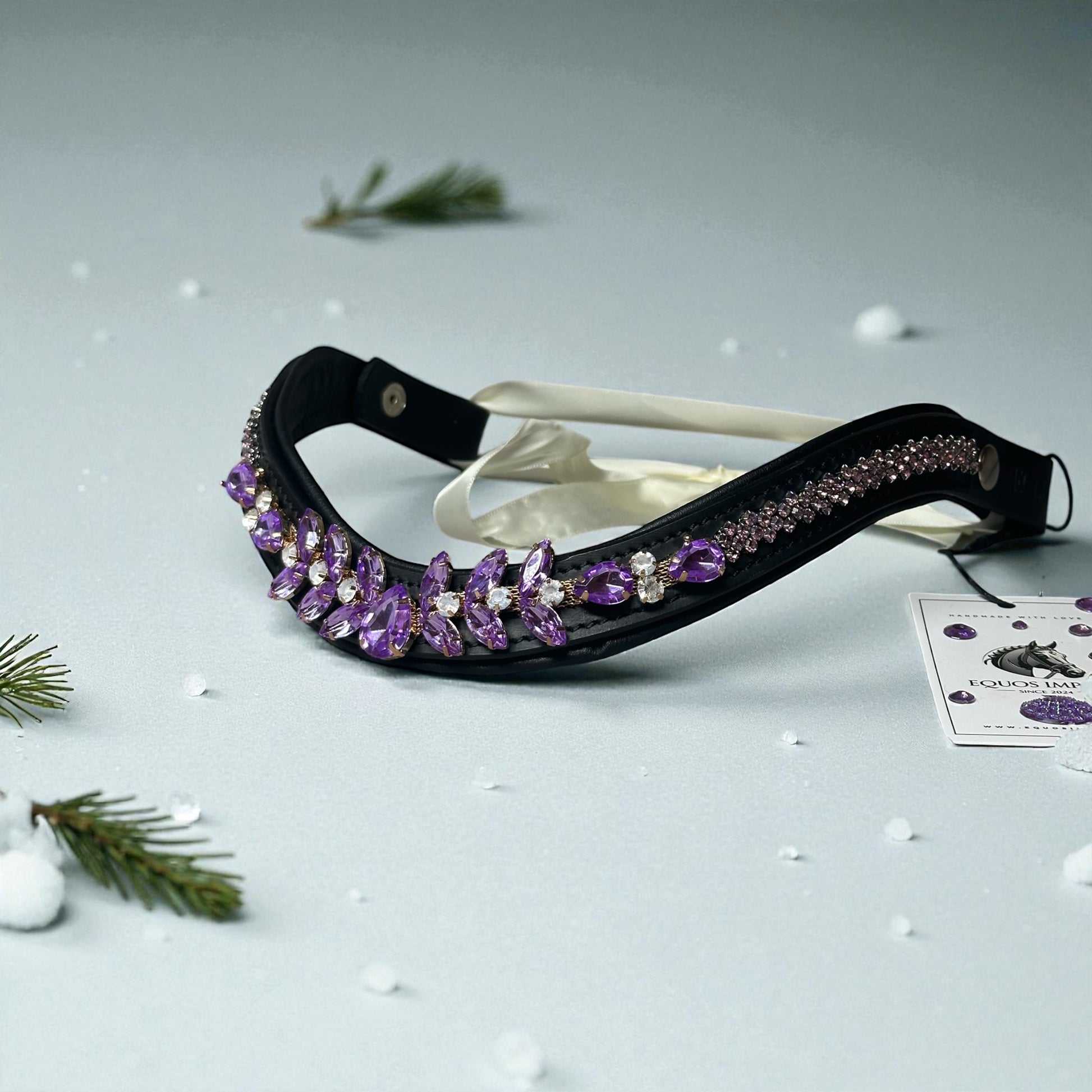 Ein Design so edel wie eine Meeresprinzessin. „Arielle“ verzaubert mit kräftig violetten Kristallen in Tropfen- und Navetteform, die in feinem Gold eingefasst sind und wunderschön mit funkelnden klaren Steinen kombiniert werden. Die sanft geschwungene Form sorgt für ein elegantes Gesamtbild und lässt jedes Pferd erstrahlen.