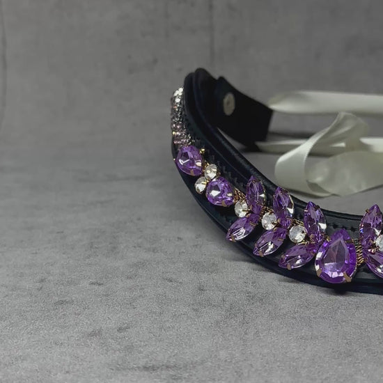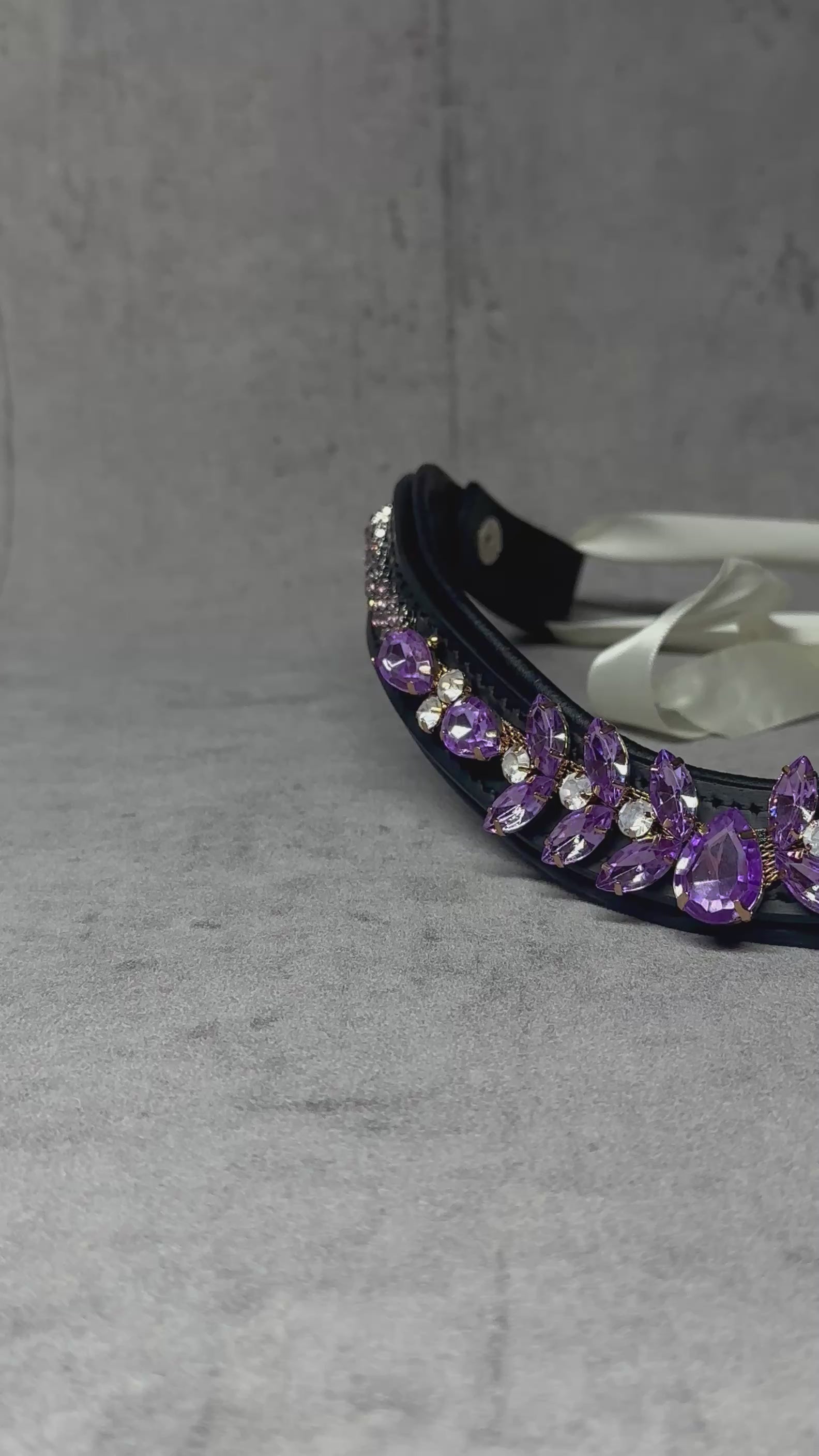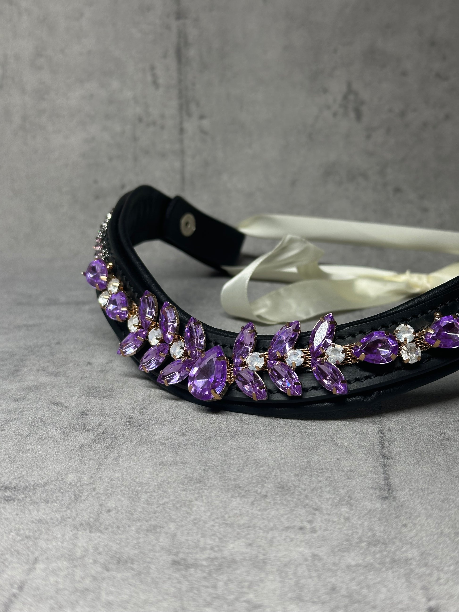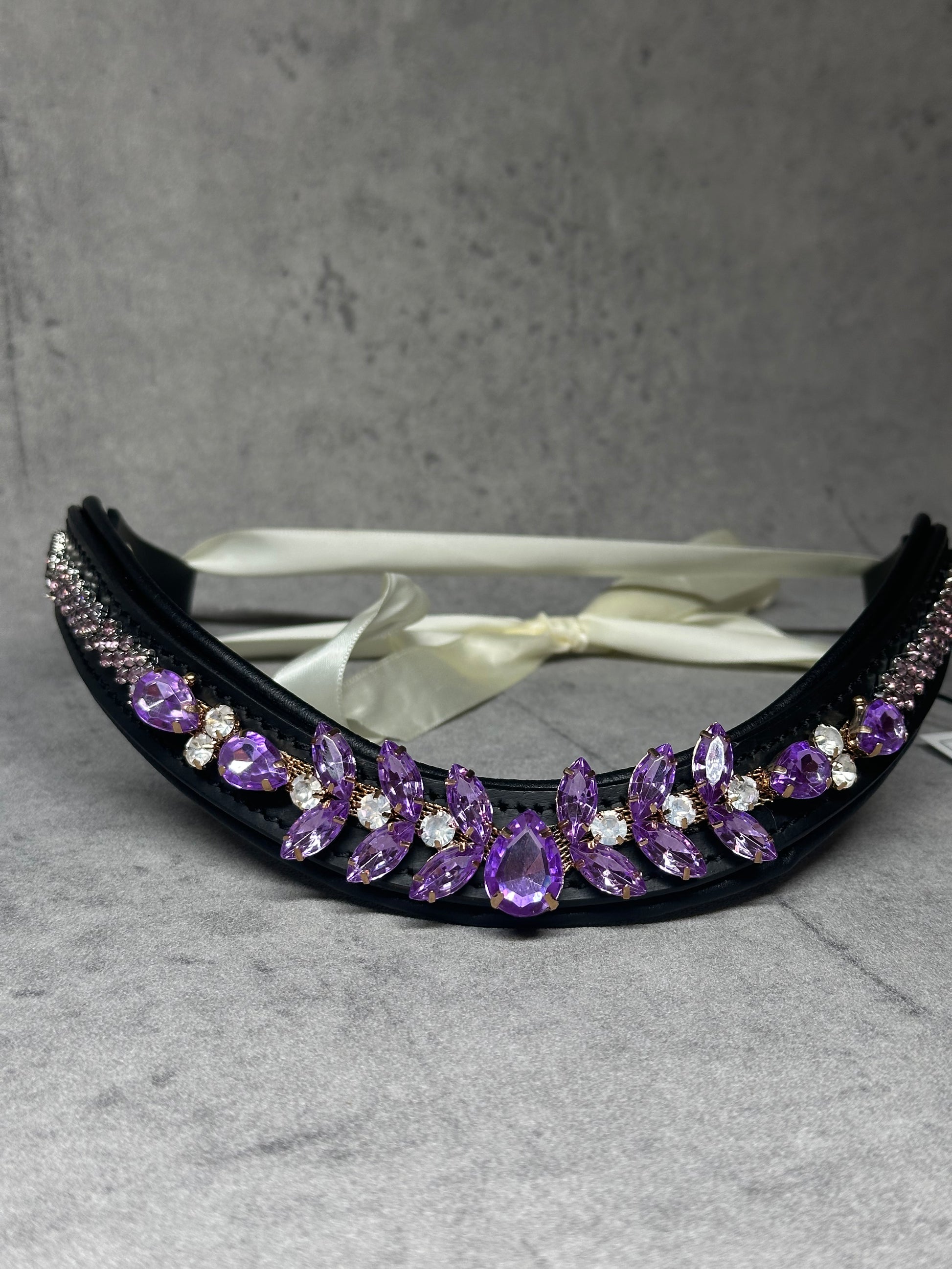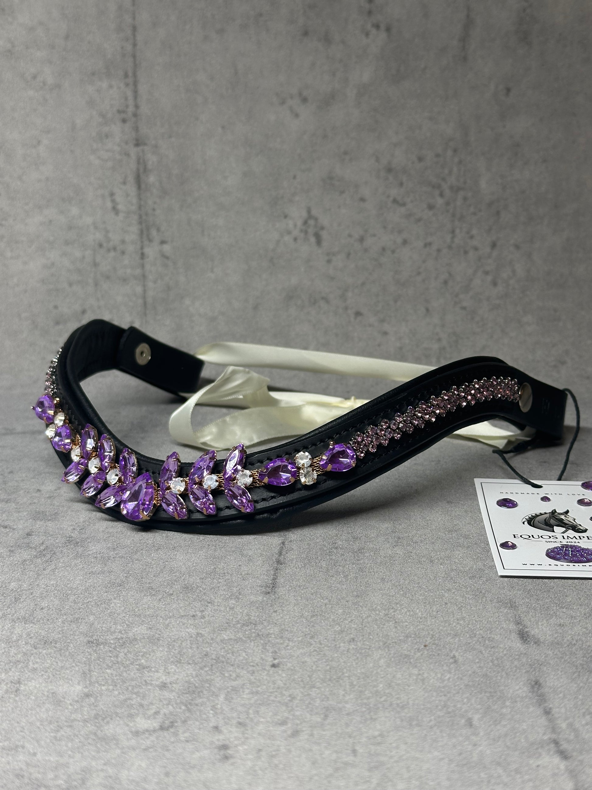 Ein Design so edel wie eine Meeresprinzessin. „Arielle“ verzaubert mit kräftig violetten Kristallen in Tropfen- und Navetteform, die in feinem Gold eingefasst sind und wunderschön mit funkelnden klaren Steinen kombiniert werden. Die sanft geschwungene Form sorgt für ein elegantes Gesamtbild und lässt jedes Pferd erstrahlen.
