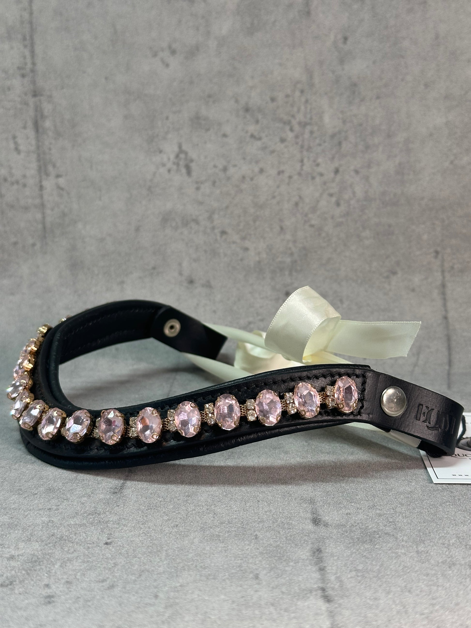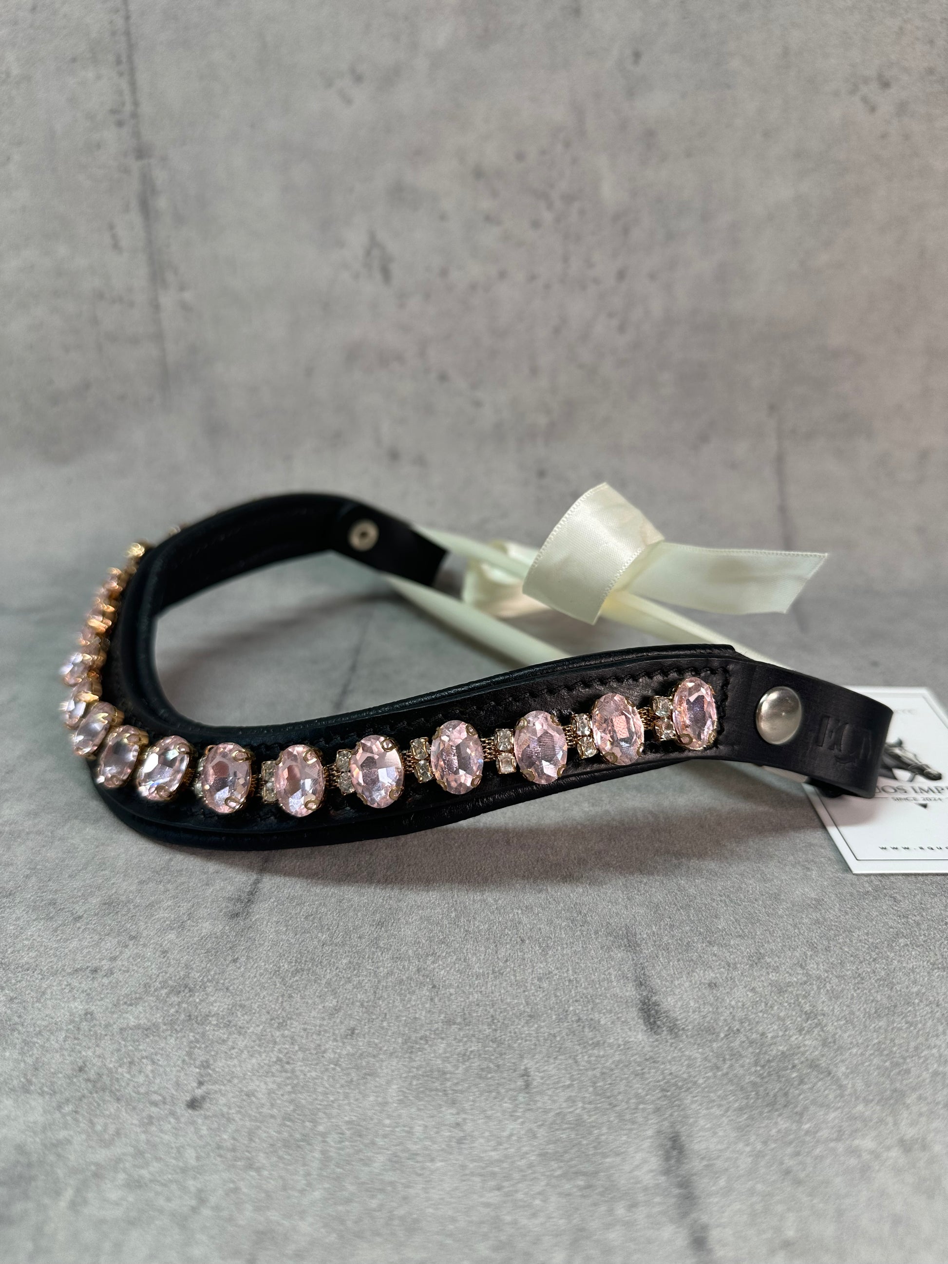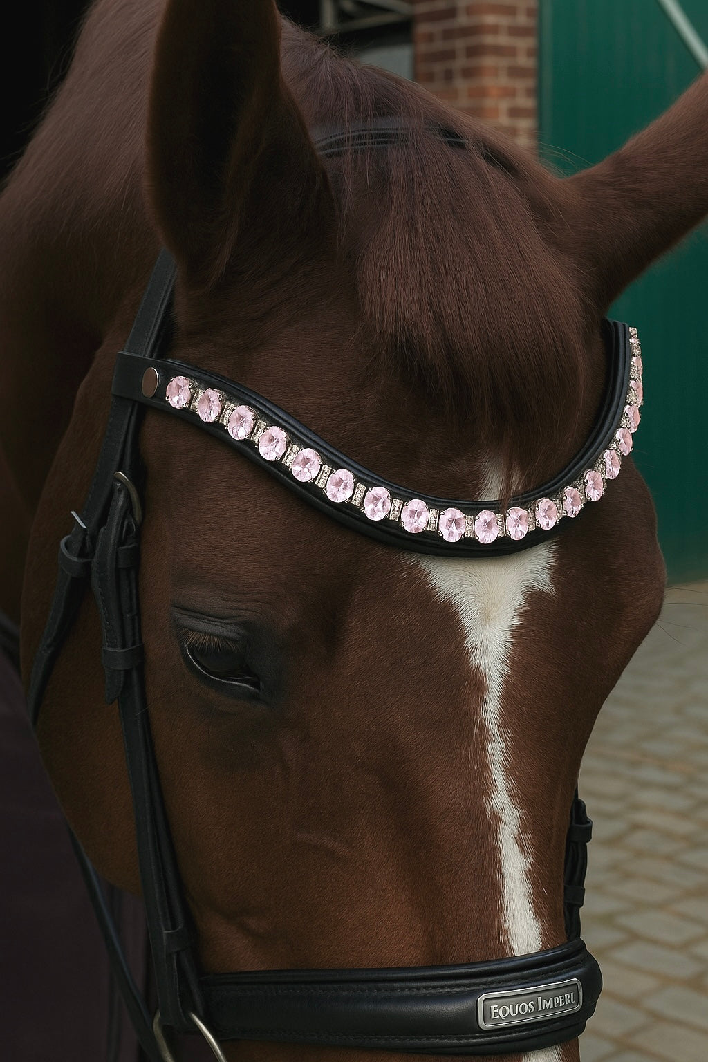 Der Stirnriemen Ballerina (hier mit schwarzem Leder auf den Bildern) begeistert mit seinem strahlenden rosa Farbenden und filigranen Strasssteinen, die im Licht elegant funkeln. Dank des praktischen Schnellverschlusses sitzt er immer perfekt und lässt sich im Handumdrehen anlegen – so spielst du stilvoll mit deinem Look!