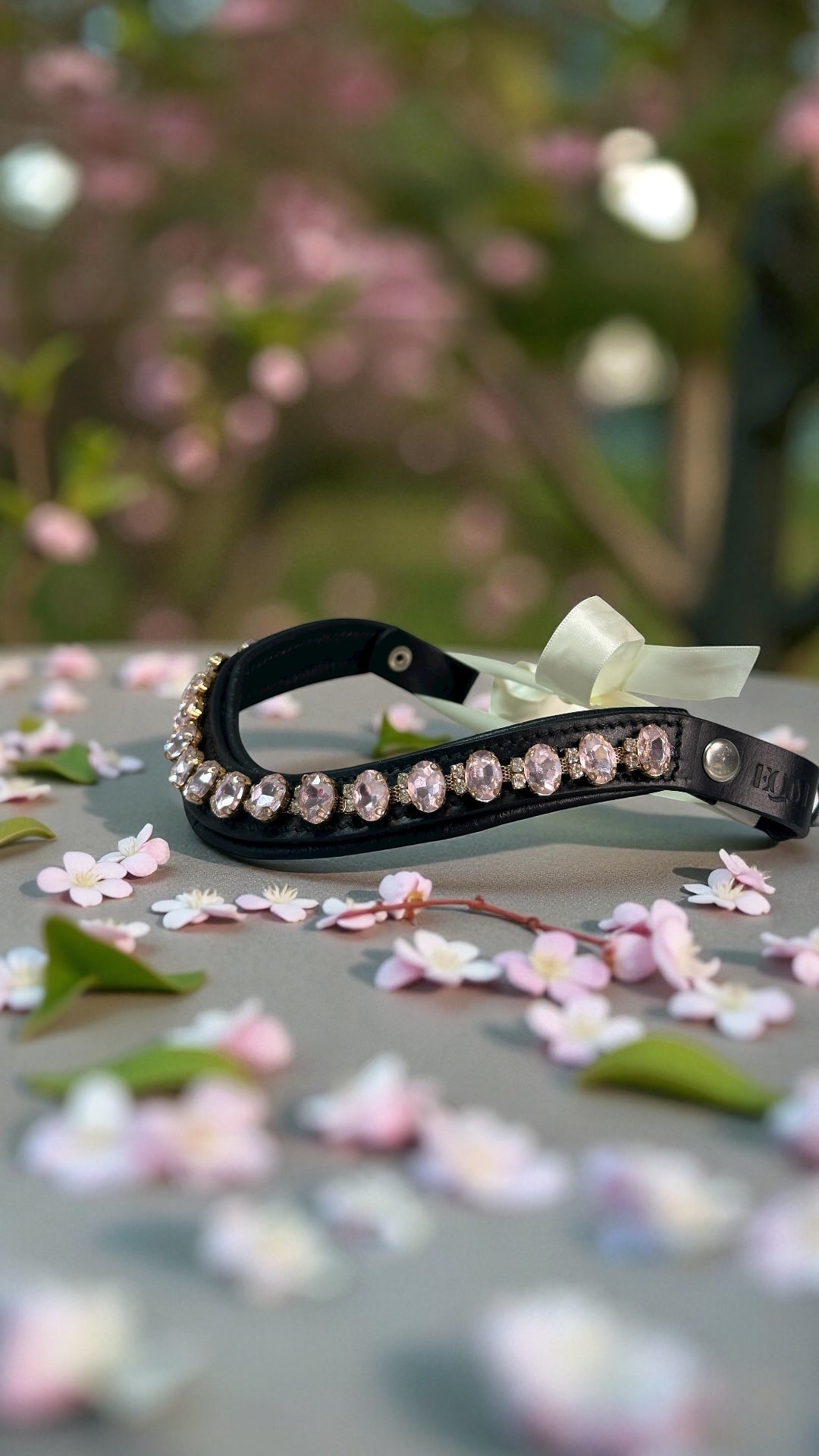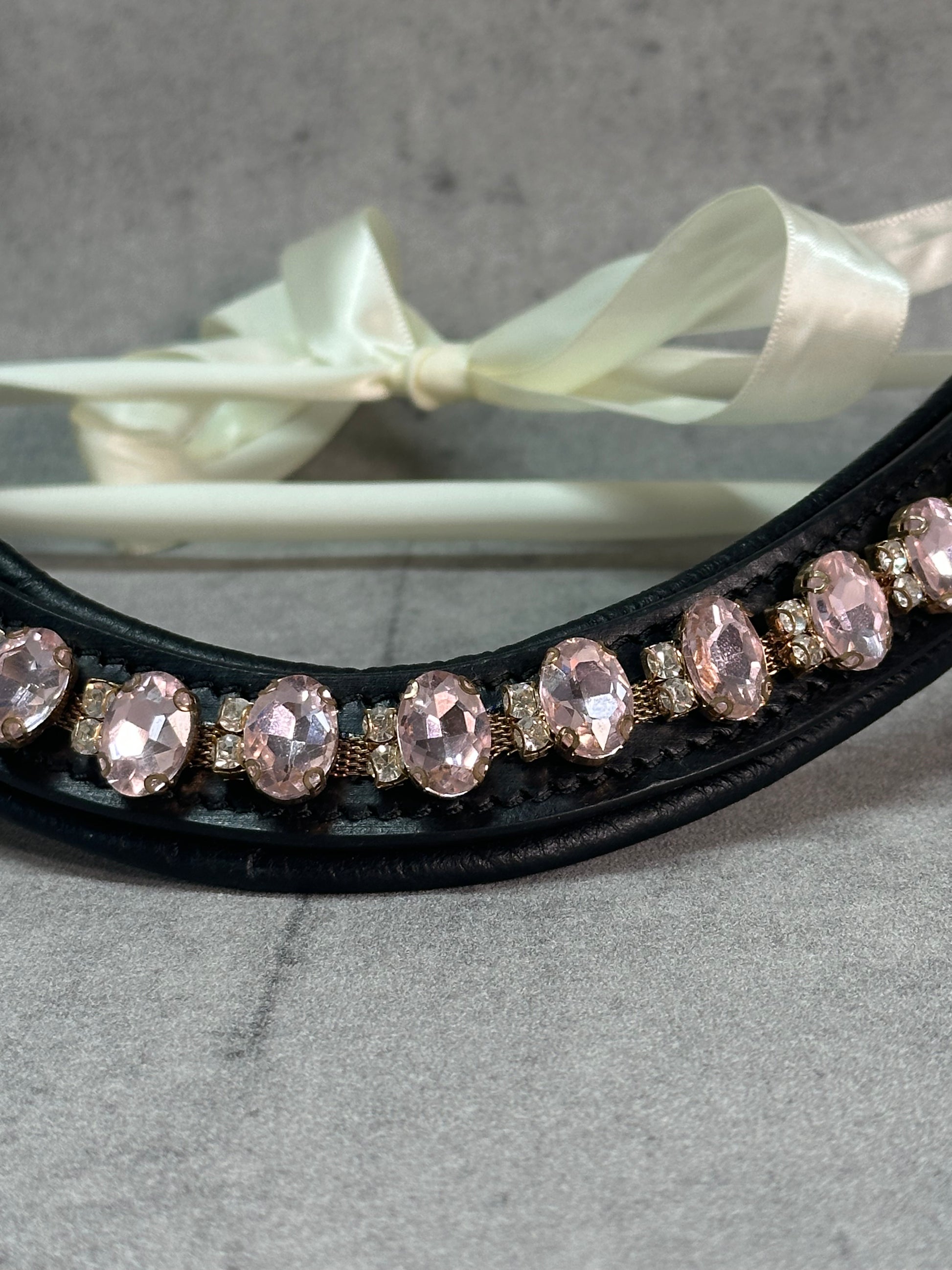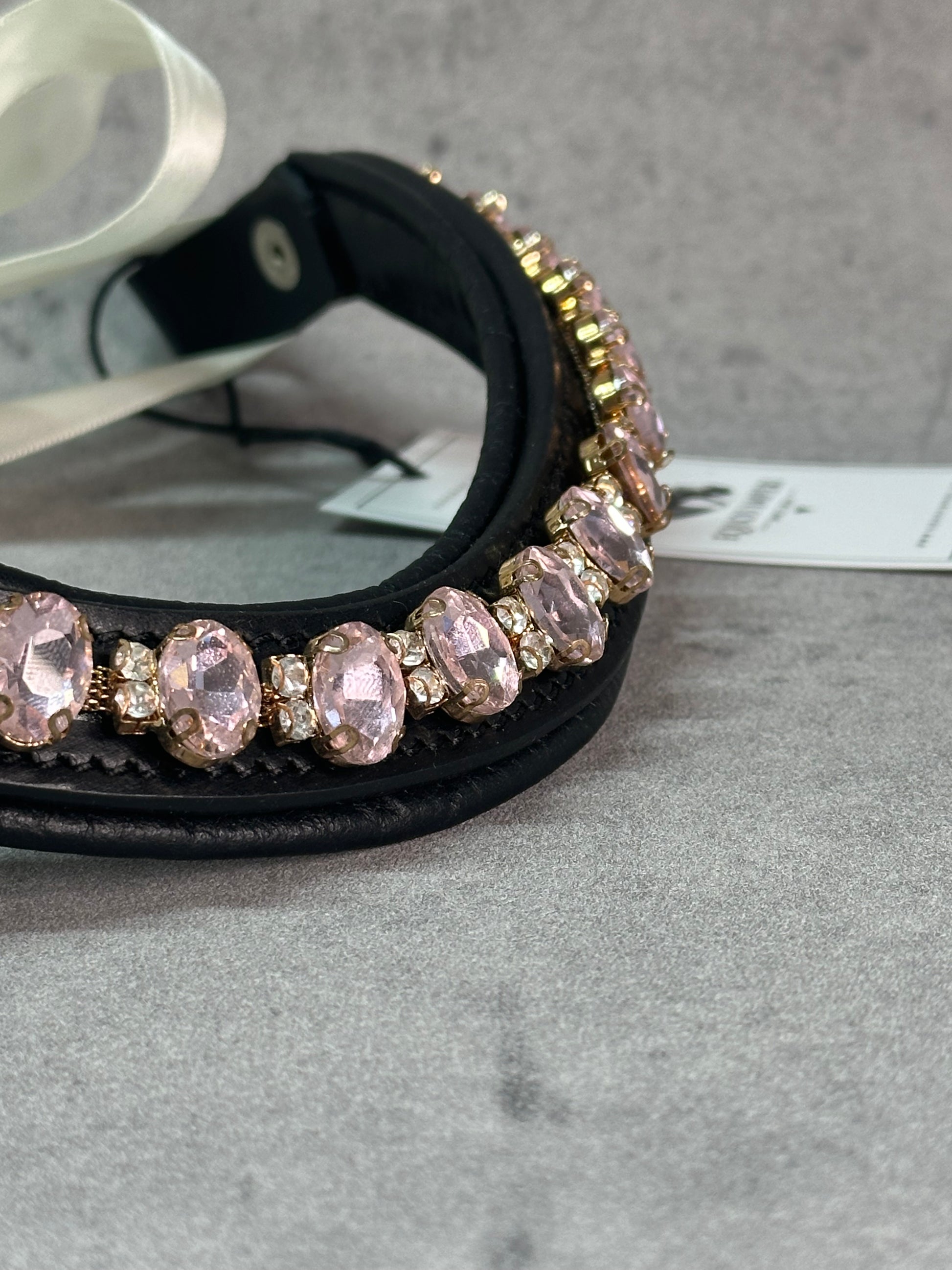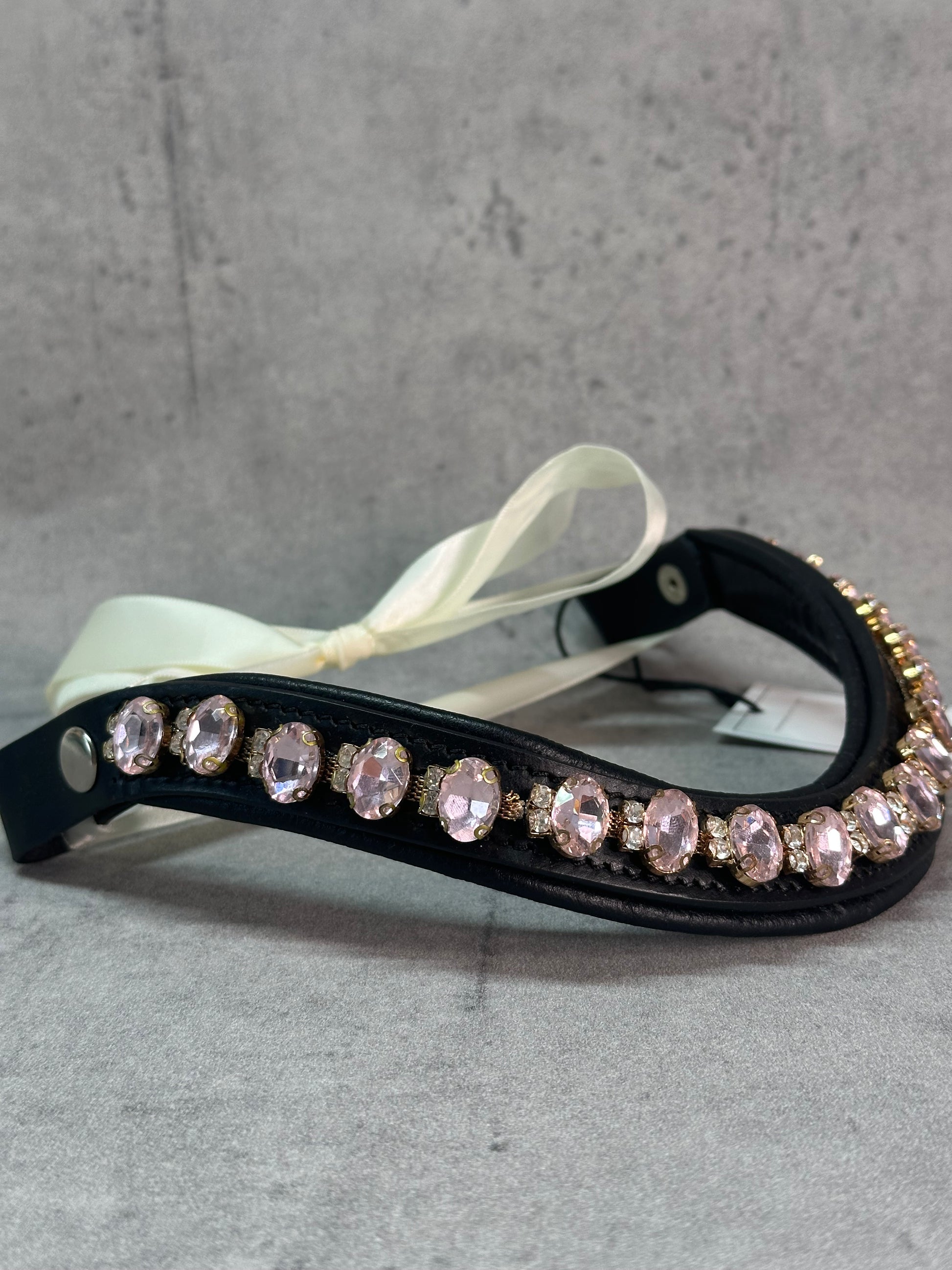 Der Stirnriemen Ballerina (hier mit schwarzem Leder auf den Bildern) begeistert mit seinem strahlenden rosa Farbenden und filigranen Strasssteinen, die im Licht elegant funkeln. Dank des praktischen Schnellverschlusses sitzt er immer perfekt und lässt sich im Handumdrehen anlegen – so spielst du stilvoll mit deinem Look!