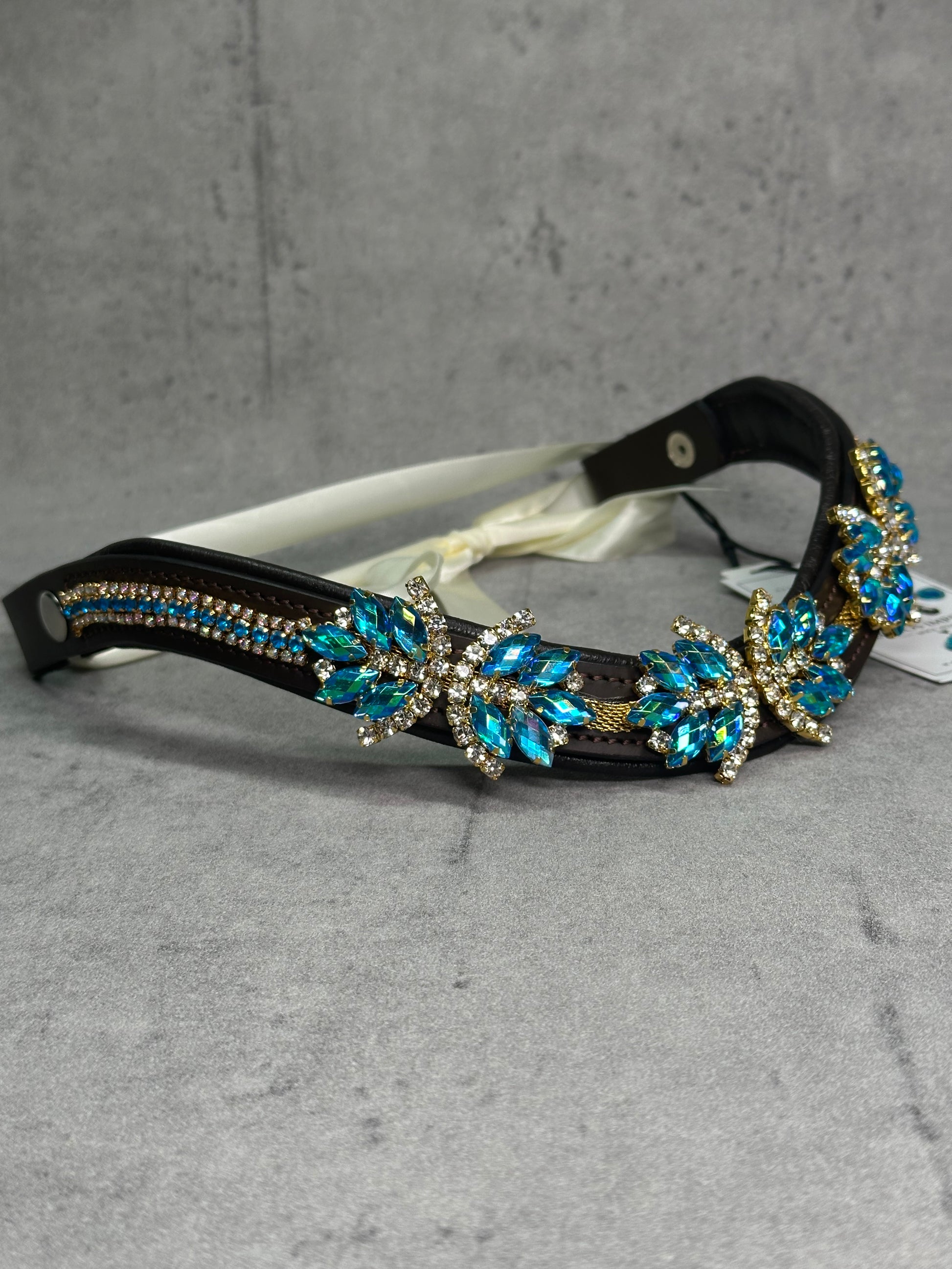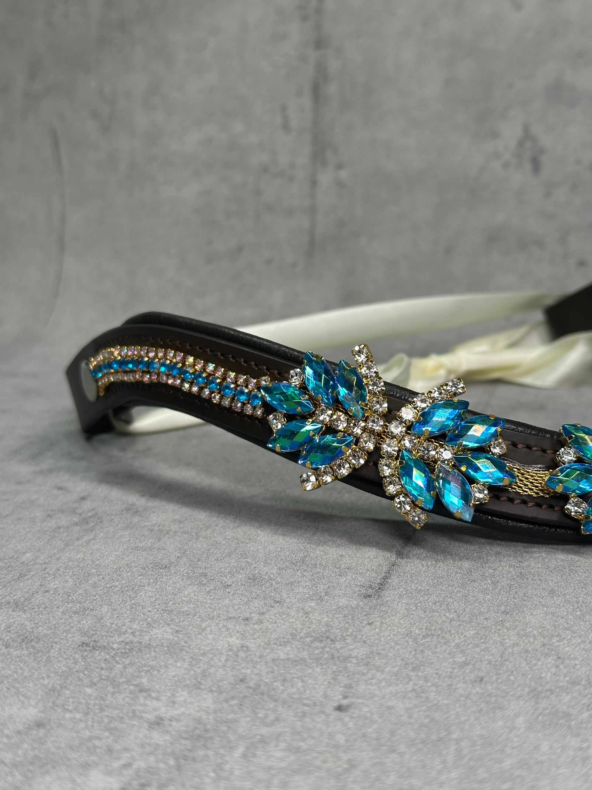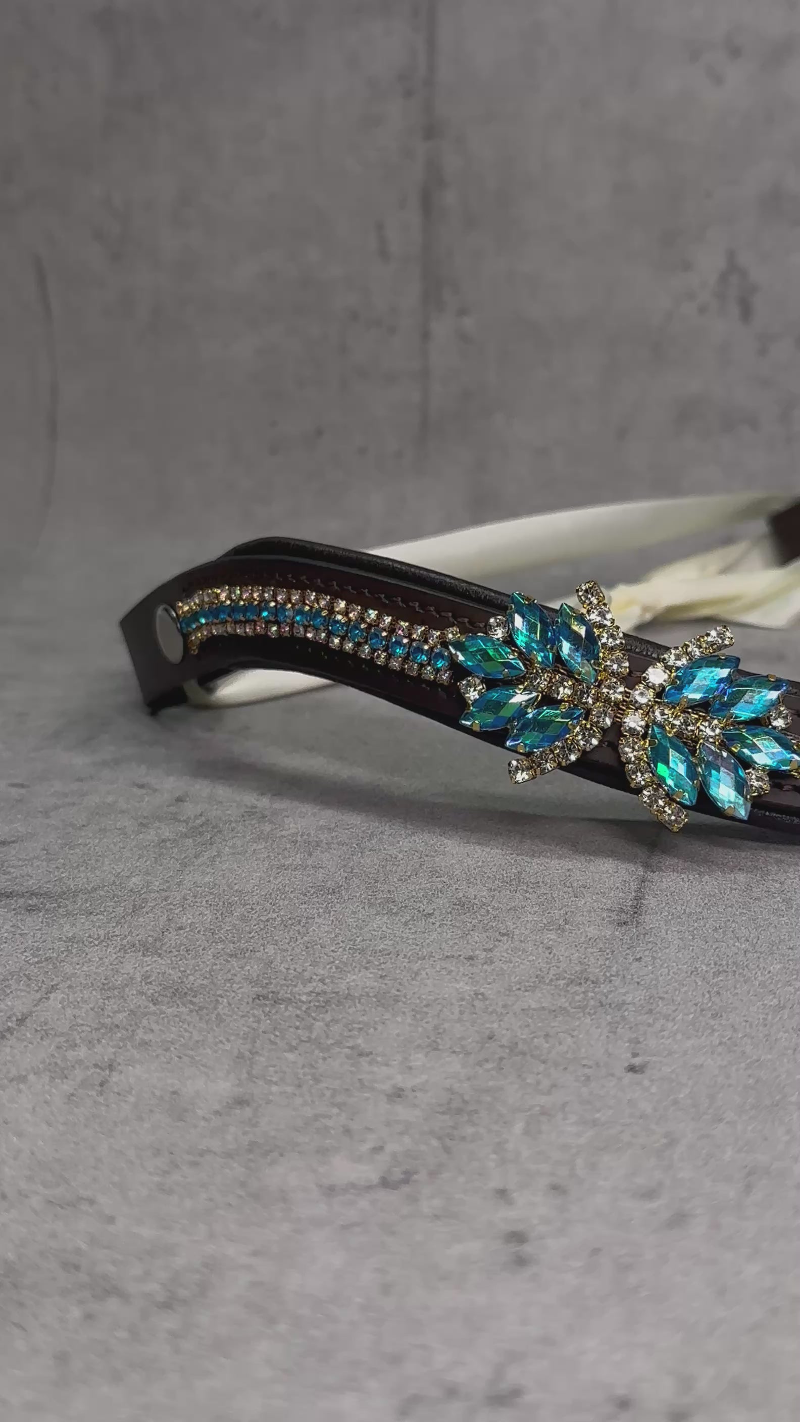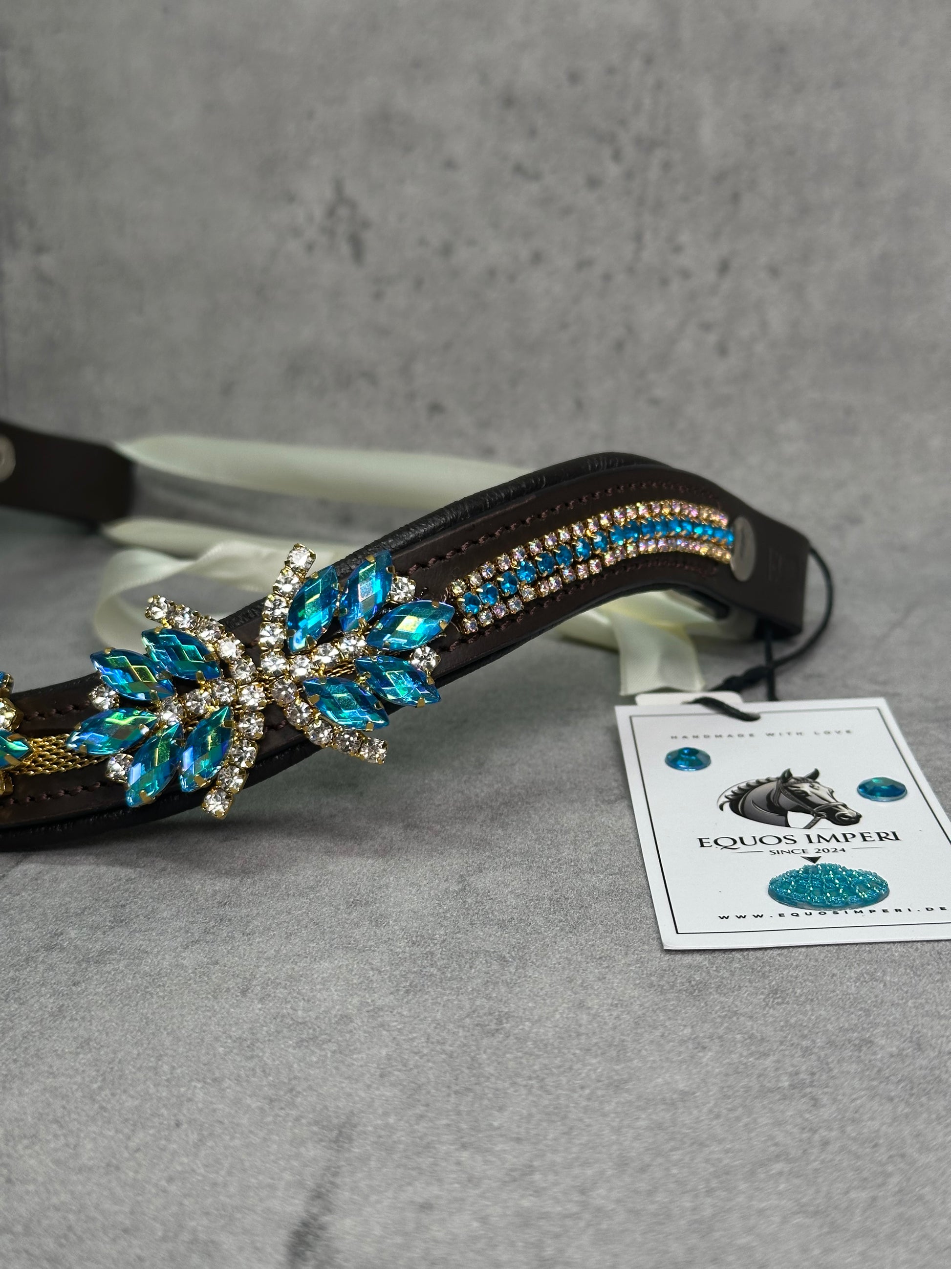 Mit unserem "Bora Bora" Stirnriemen in Pink mit goldenen und blauen Details wird jedes Pferd zum absoluten Hingucker. Die pinke Strasssteinverzierung auf dem braunen Lederband und der praktische Schnellverschluss machen nicht nur optisch, sondern auch beim Anlegen eine tolle Figur. Dein Pferd wird bewundernswert aussehen!