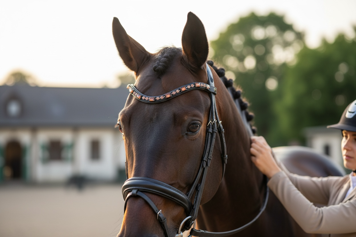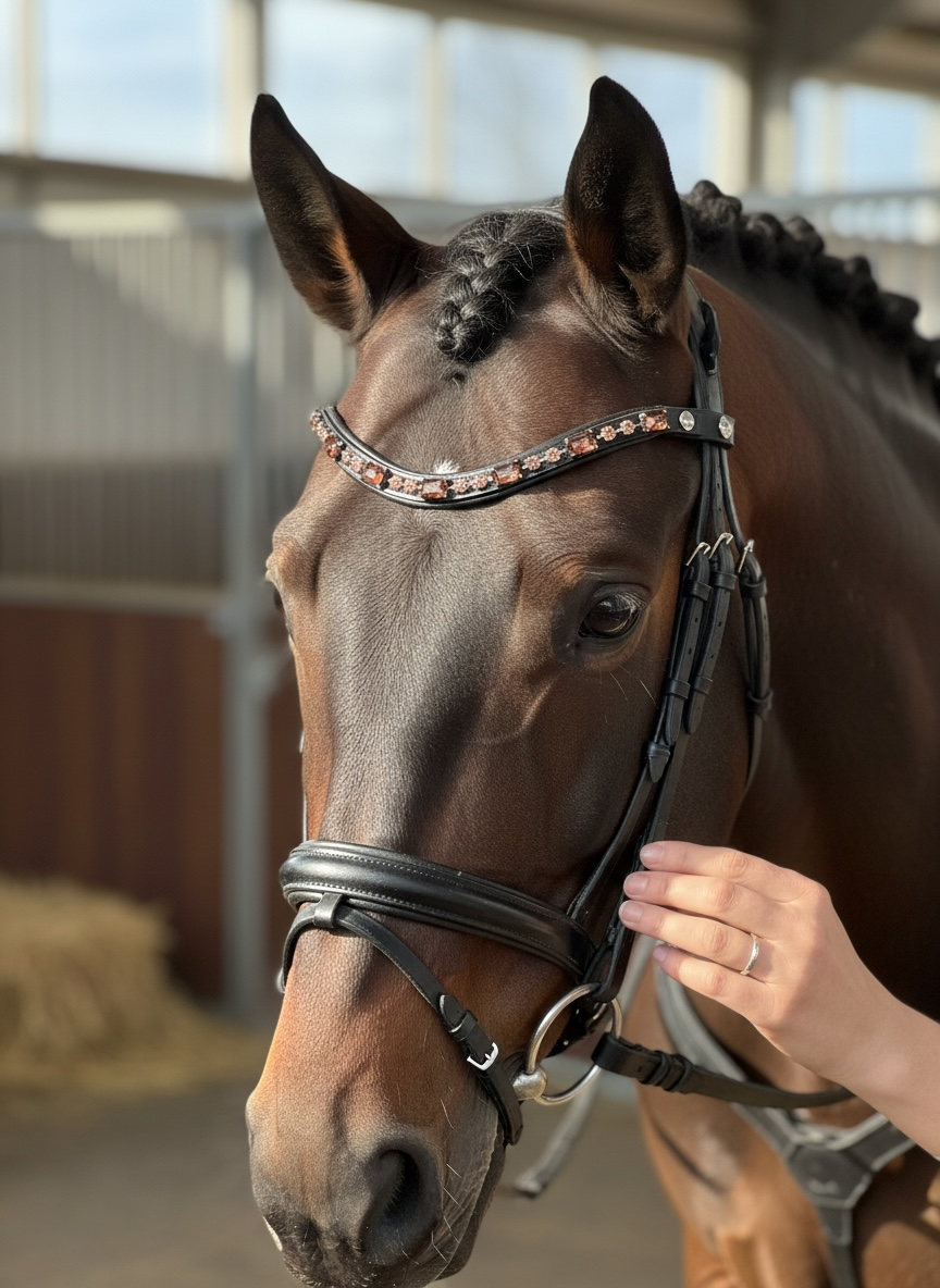 Der Stirnriemen Burgundry ist ein hochwertiger Stirnriemen für Pferde, ausgestattet mit einem praktischen Schnellverschluss. Dieser ermöglicht eine zeitsparende Anpassung und erleichtert das Anlegen. Die Anwendung verbessert die Handhabung und Sicherheit während des Reitens, wodurch eine effiziente Nutzung gewährleistet wird.