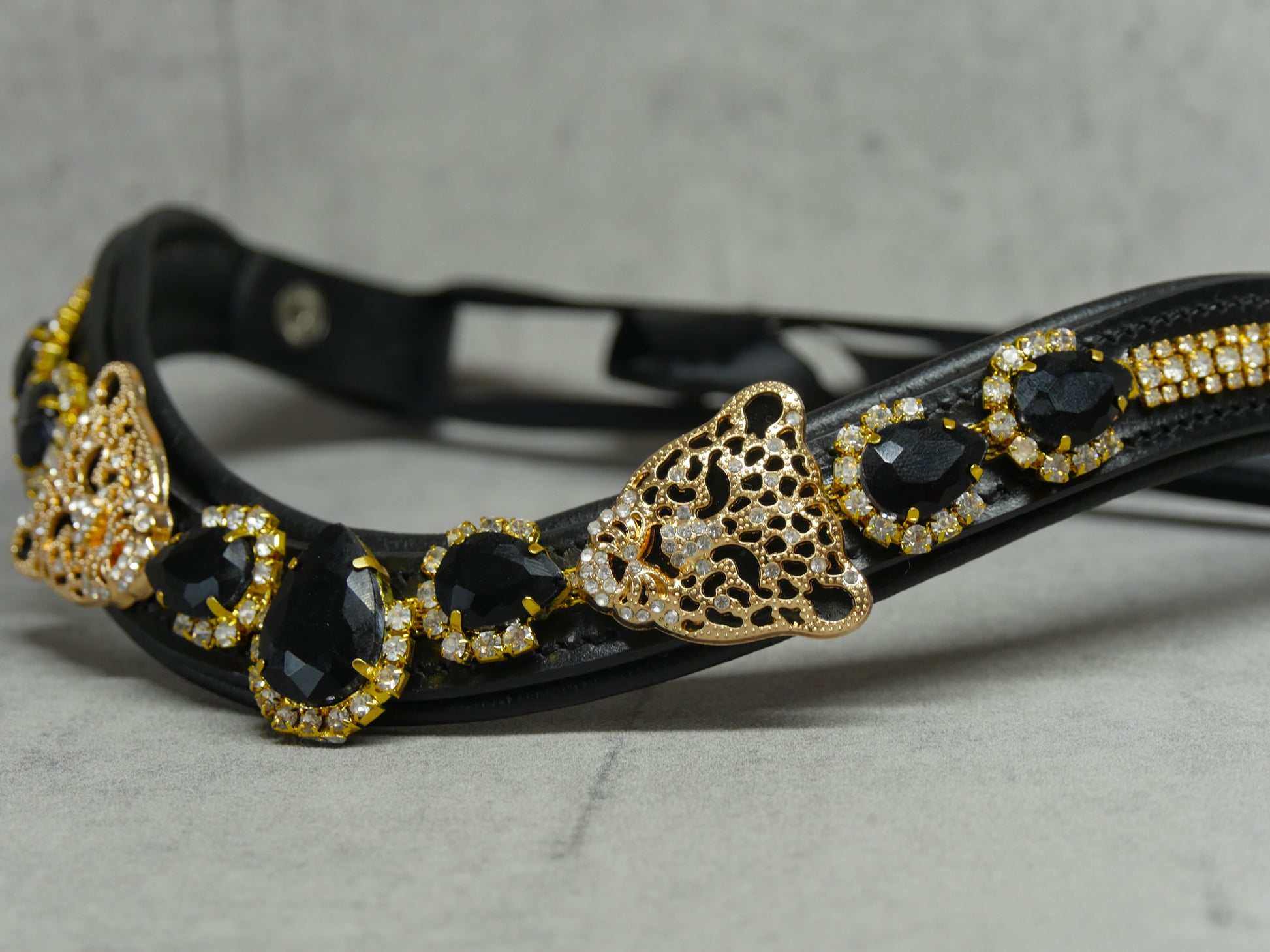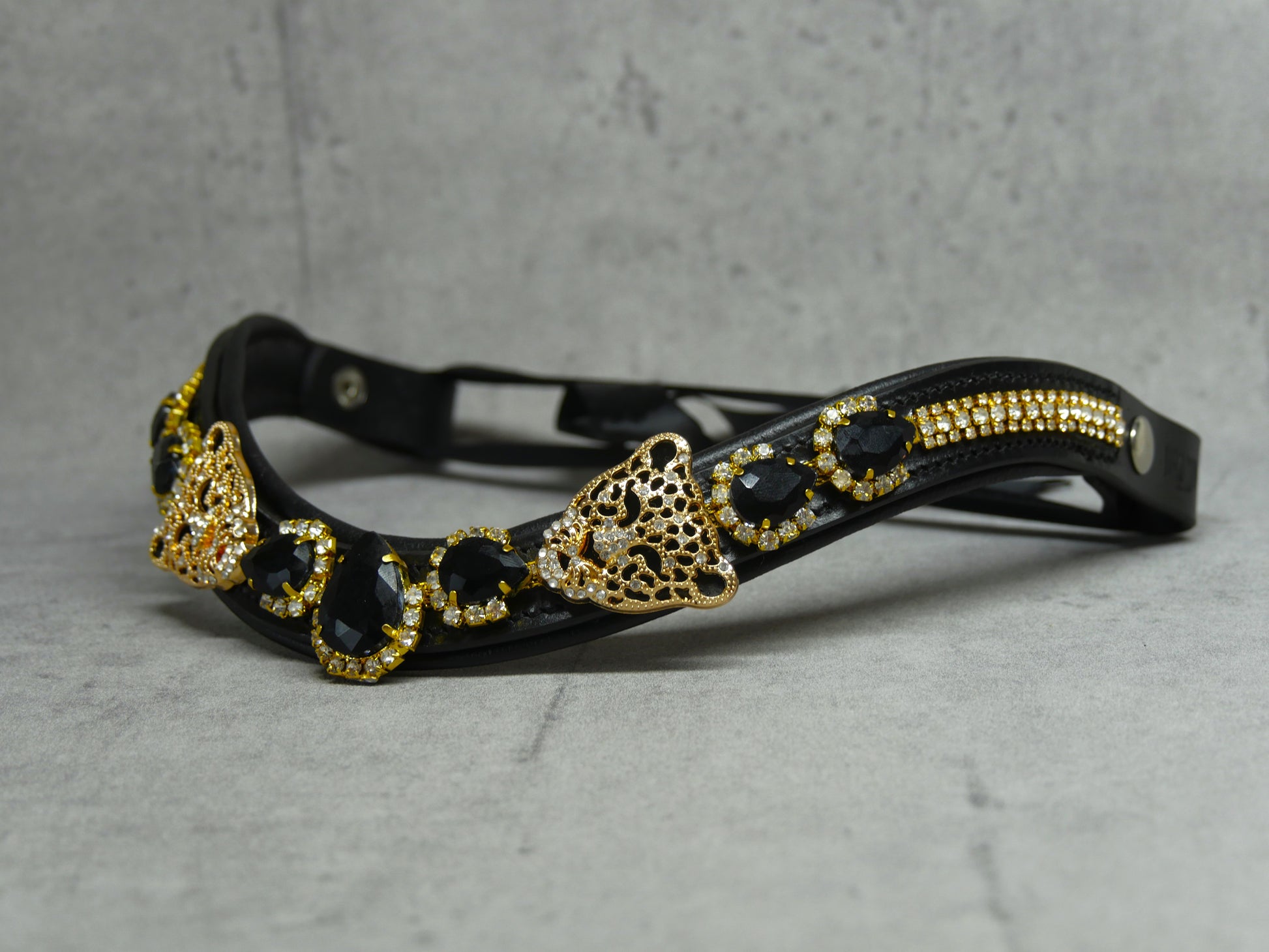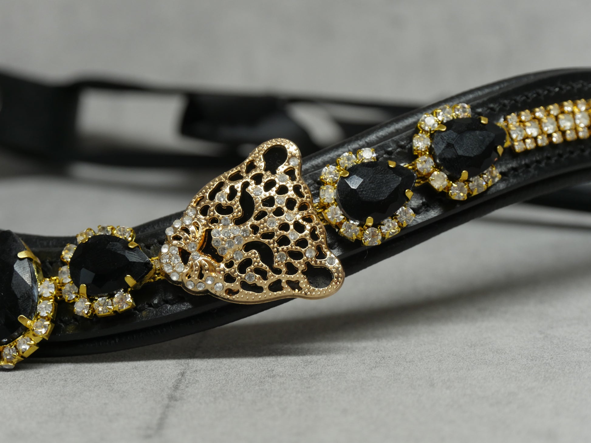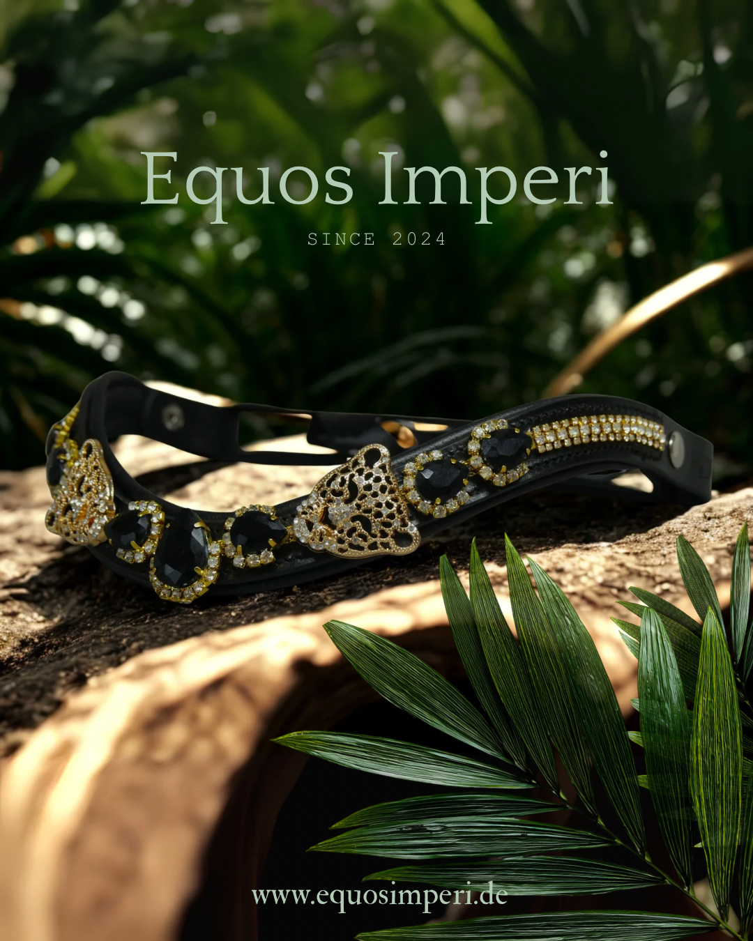 Verleihen Sie Ihrem Pferd einen glamourösen Auftritt mit unserem Stirnriemen "Golden Tiger". Die funkelnden Glitzerelemente setzen bezaubernde Akzente, während der praktische Schnellverschluss für mühelose Handhabung sorgt. Ein unverzichtbares Accessoire für stilbewusste Reiter, die Wert auf Eleganz und Funktionalität legen.