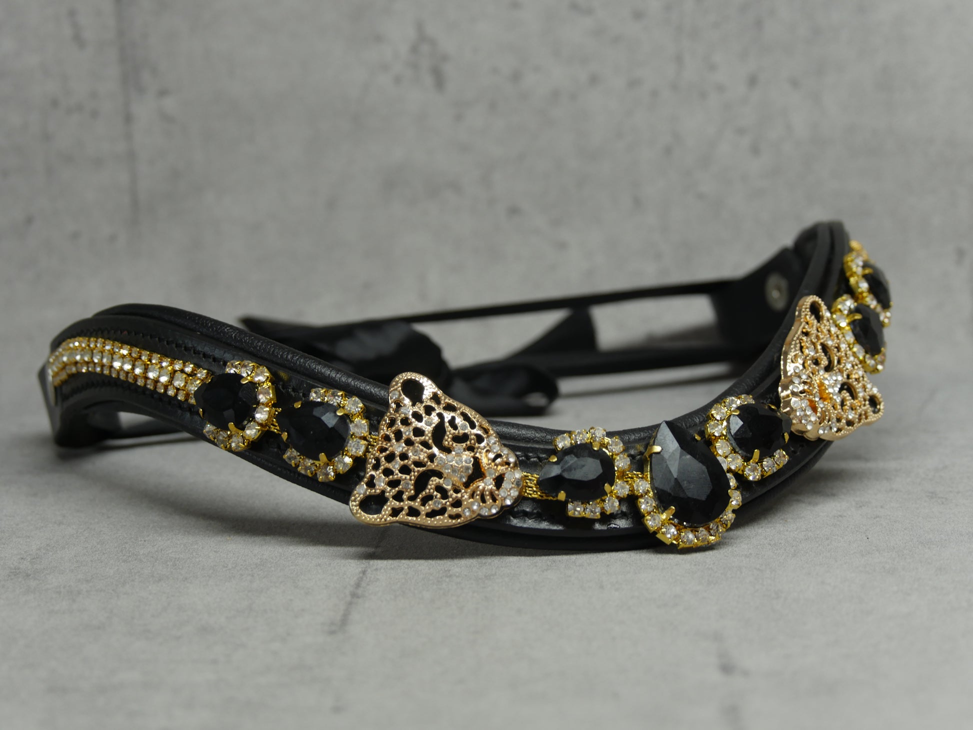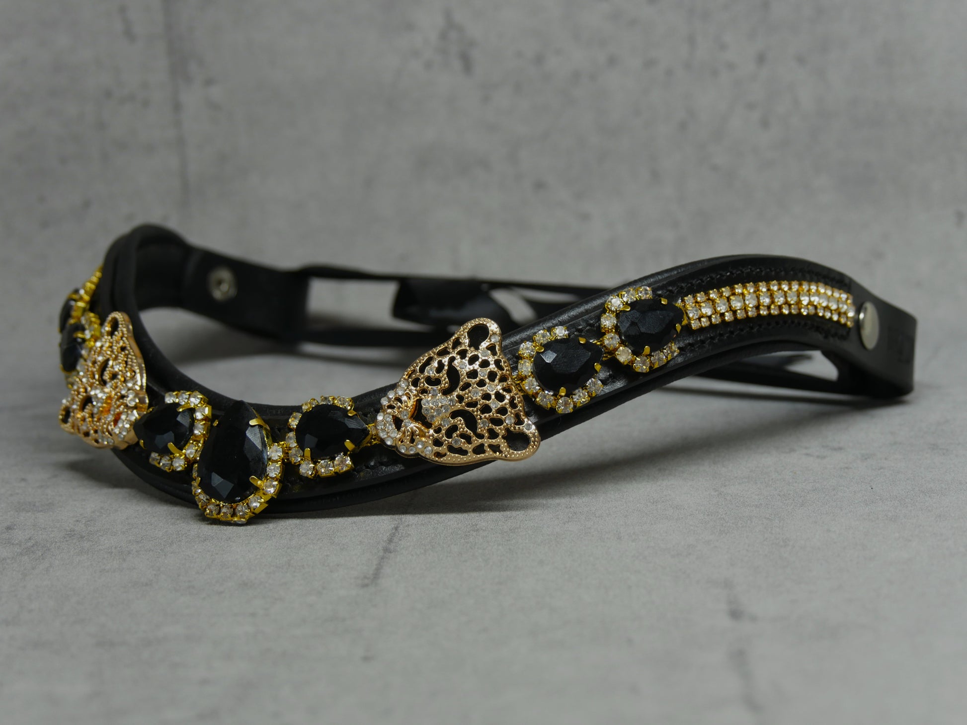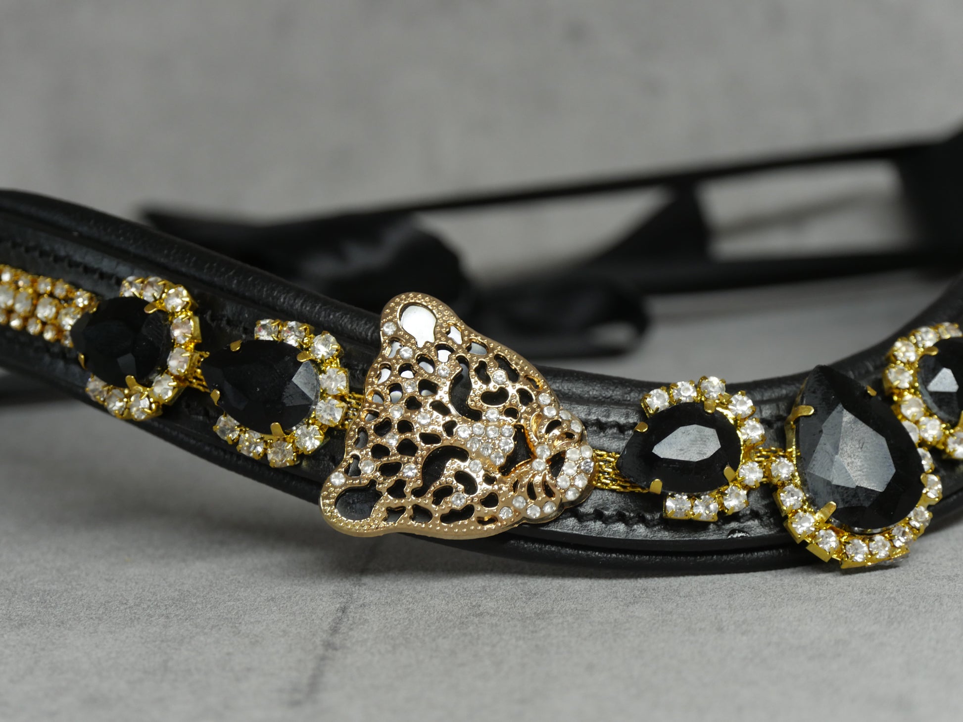 Verleihen Sie Ihrem Pferd einen glamourösen Auftritt mit unserem Stirnriemen "Golden Tiger". Die funkelnden Glitzerelemente setzen bezaubernde Akzente, während der praktische Schnellverschluss für mühelose Handhabung sorgt. Ein unverzichtbares Accessoire für stilbewusste Reiter, die Wert auf Eleganz und Funktionalität legen.