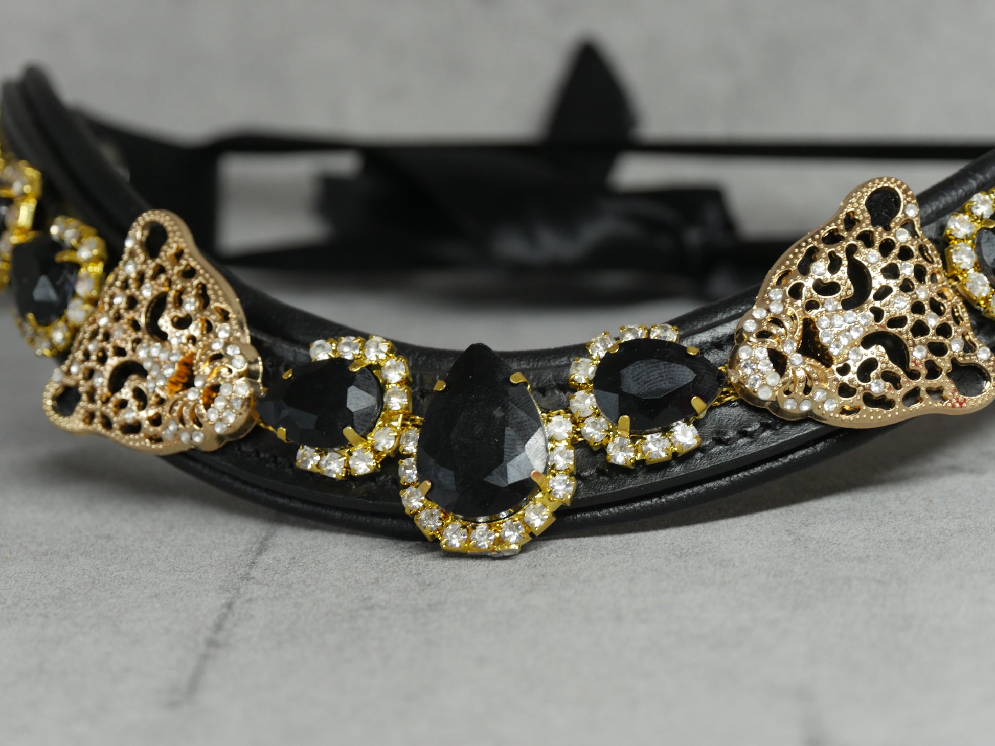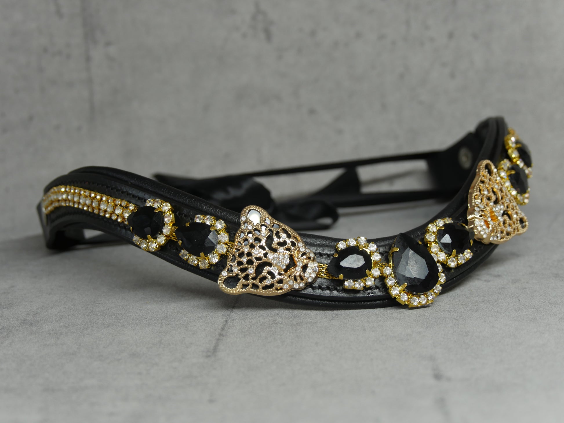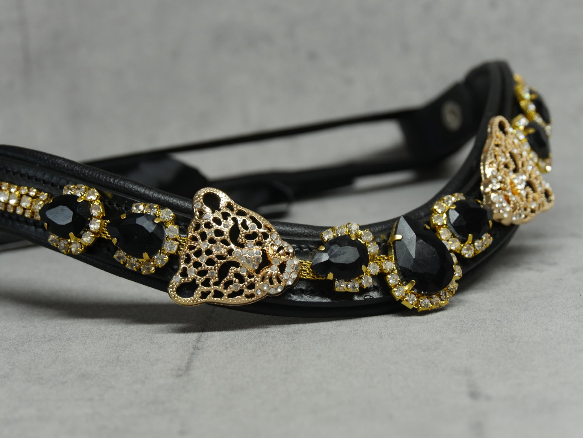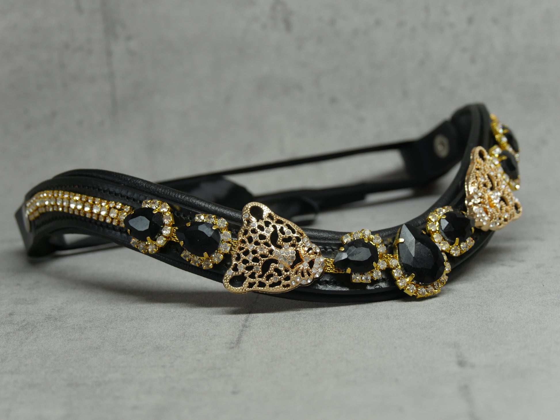 Verleihen Sie Ihrem Pferd einen glamourösen Auftritt mit unserem Stirnriemen "Golden Tiger". Die funkelnden Glitzerelemente setzen bezaubernde Akzente, während der praktische Schnellverschluss für mühelose Handhabung sorgt. Ein unverzichtbares Accessoire für stilbewusste Reiter, die Wert auf Eleganz und Funktionalität legen.