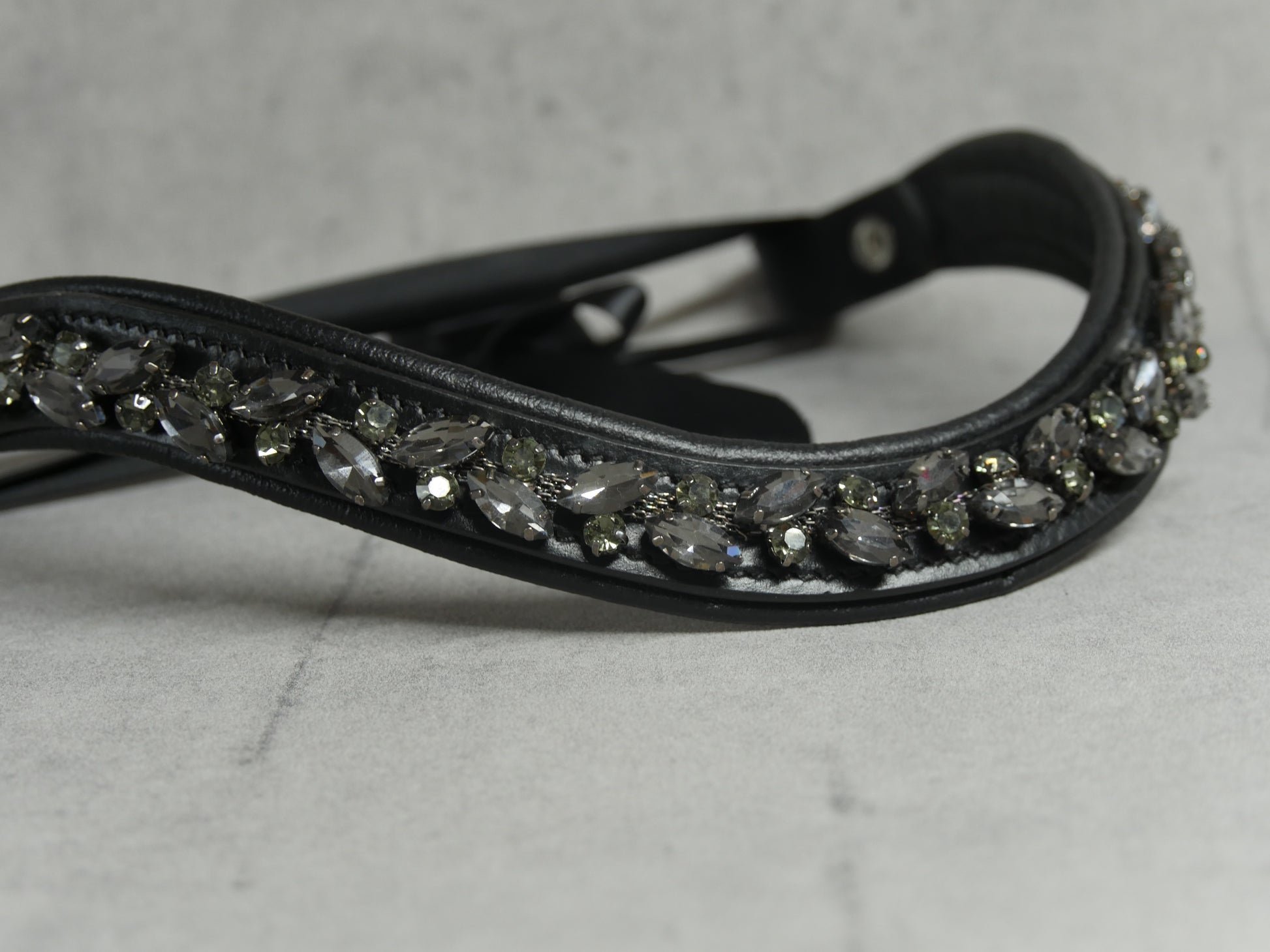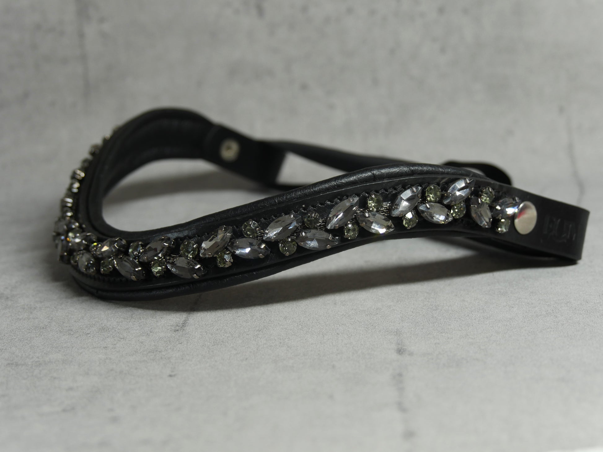 Der Stirnriemen Noir Imperiale vereint luxuriöse Eleganz mit funkelnden schwarzen Strasssteinen auf einem hochwertigen Lederband. Dank des praktischen Schnellverschlusses lässt er sich mühelos anlegen und garantiert einen sicheren, bequemen Sitz – das perfekte Accessoire für stilbewusste Pferdefreunde.