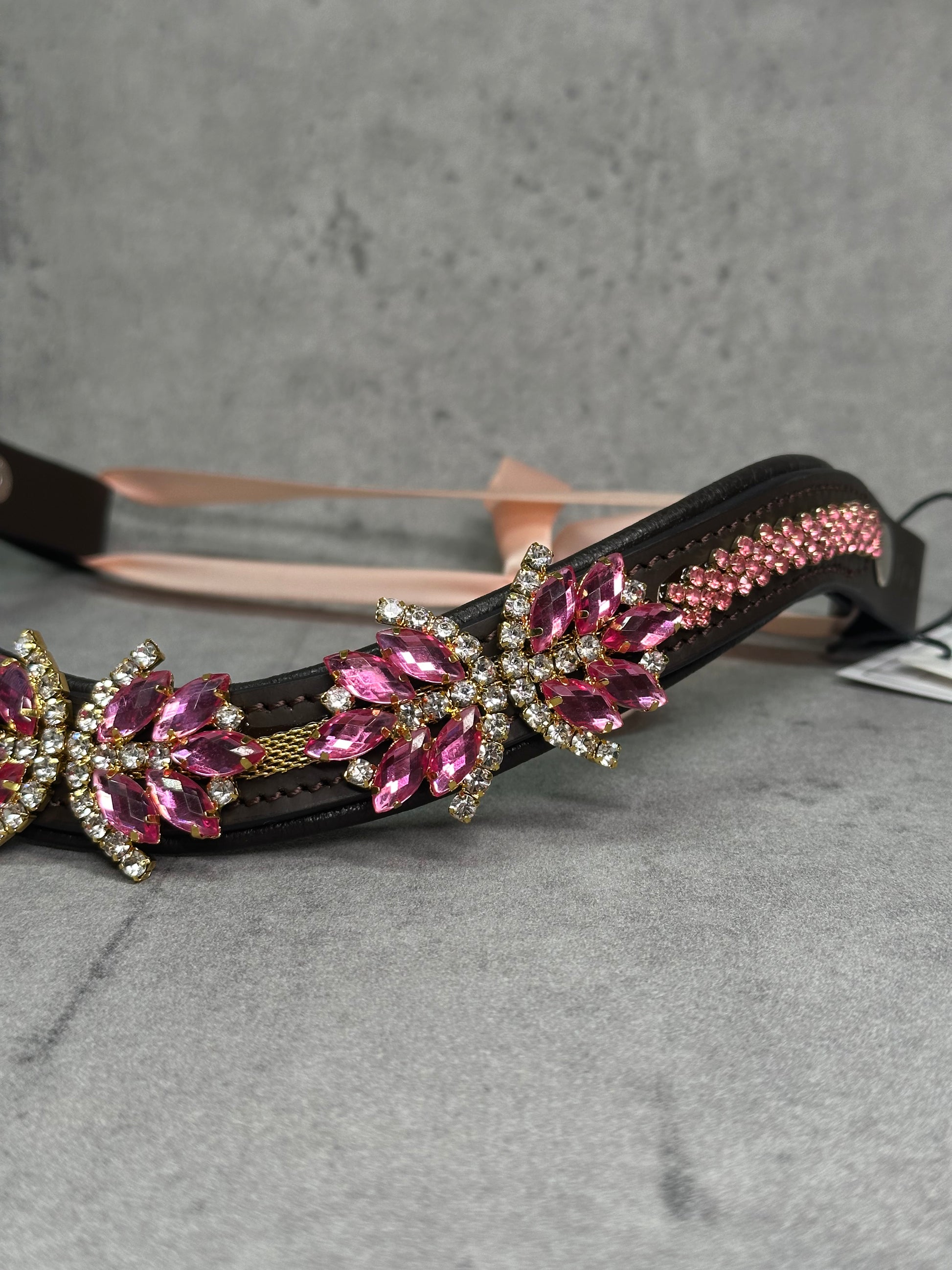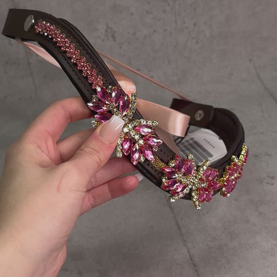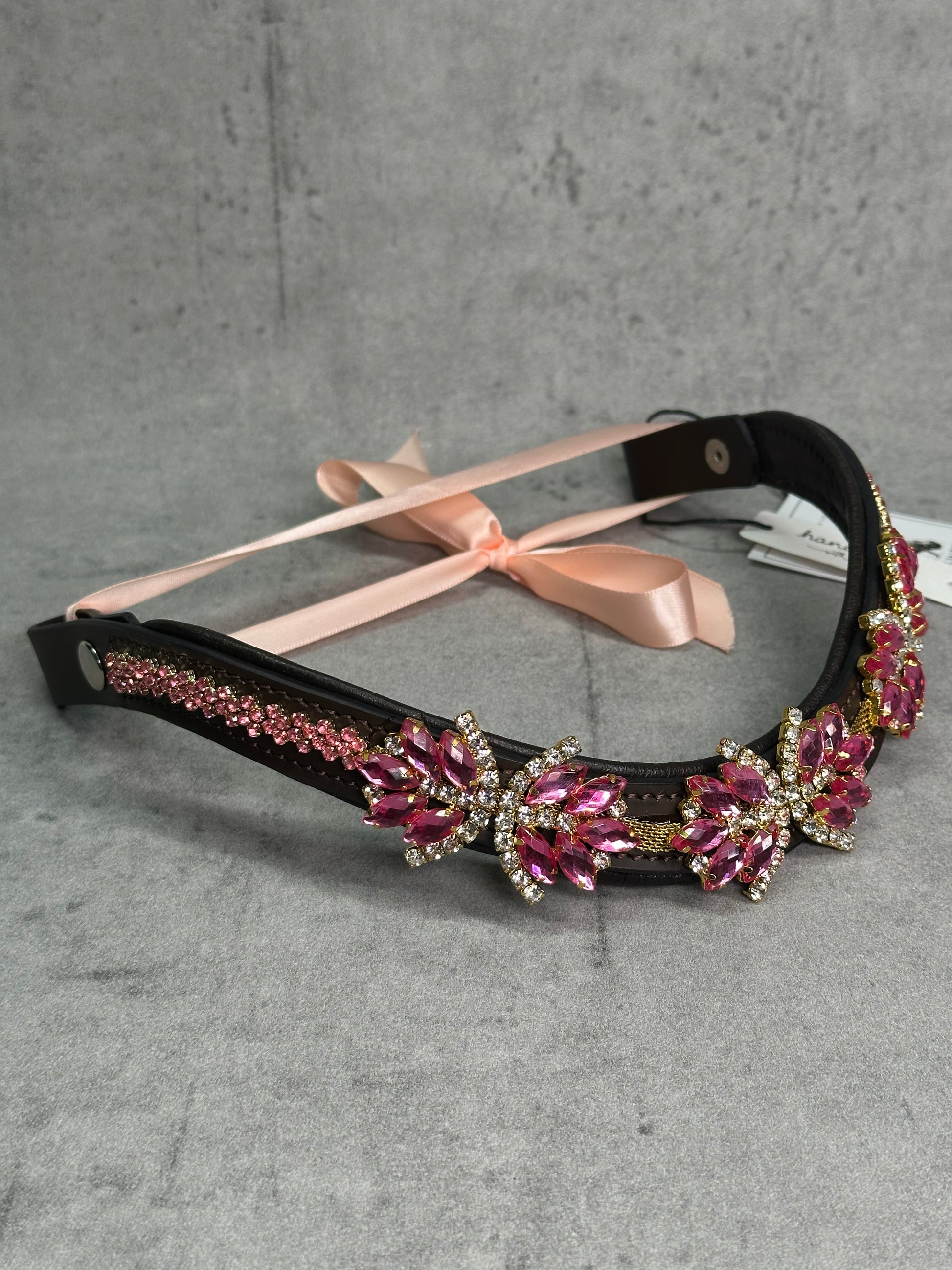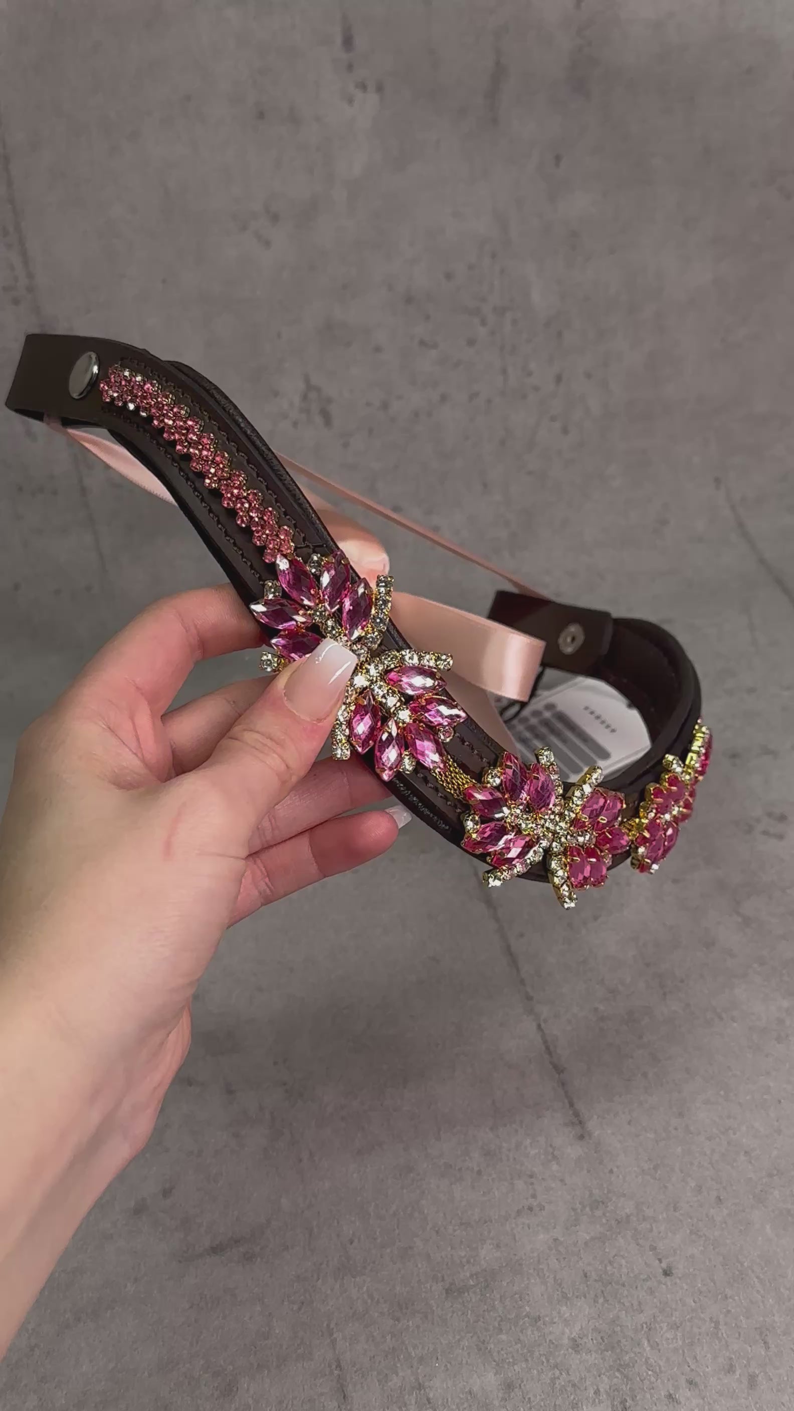 Mit unserem "Popstar" Stirnriemen in Pink mit goldenen und silbernen Details wird jedes Pferd zum absoluten Hingucker. Die pinke Strasssteinverzierung auf dem braunen Lederband und der praktische Schnellverschluss machen nicht nur optisch, sondern auch beim Anlegen eine tolle Figur. Dein Pferd wird bewundernswert aussehen!