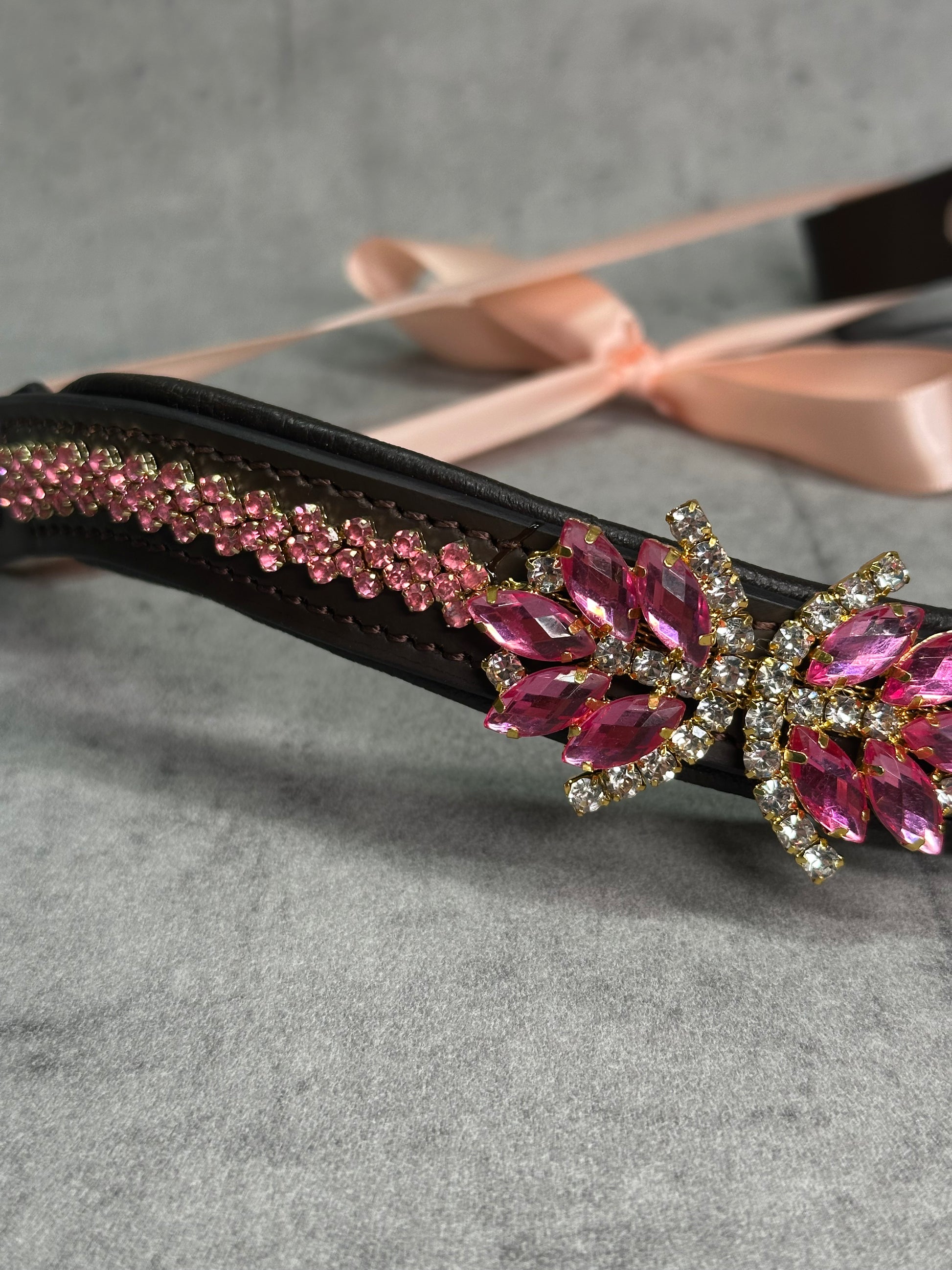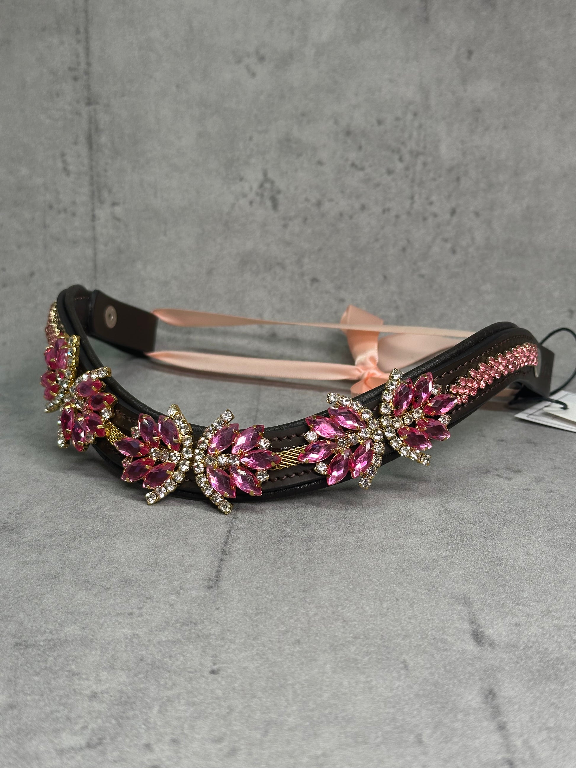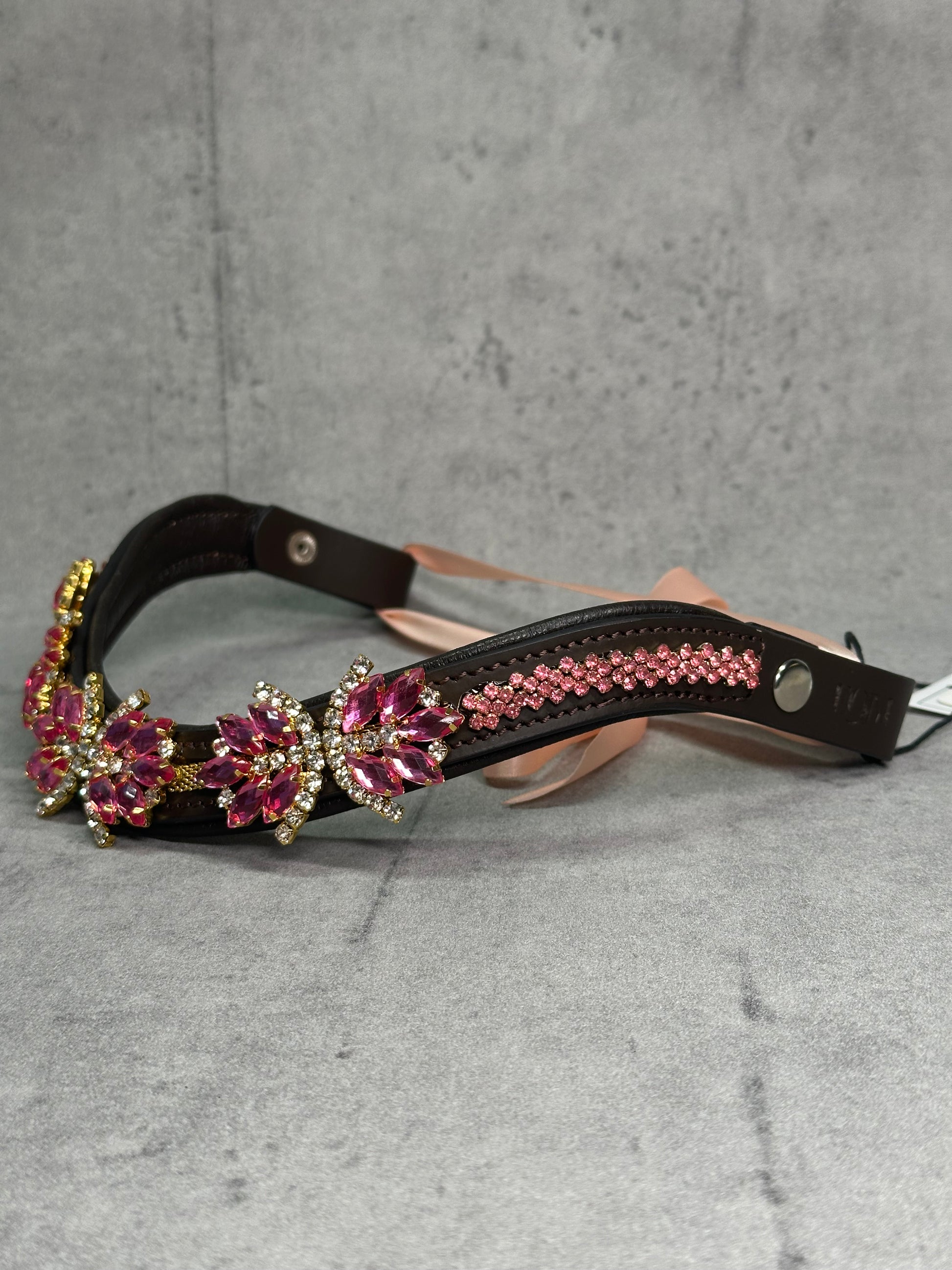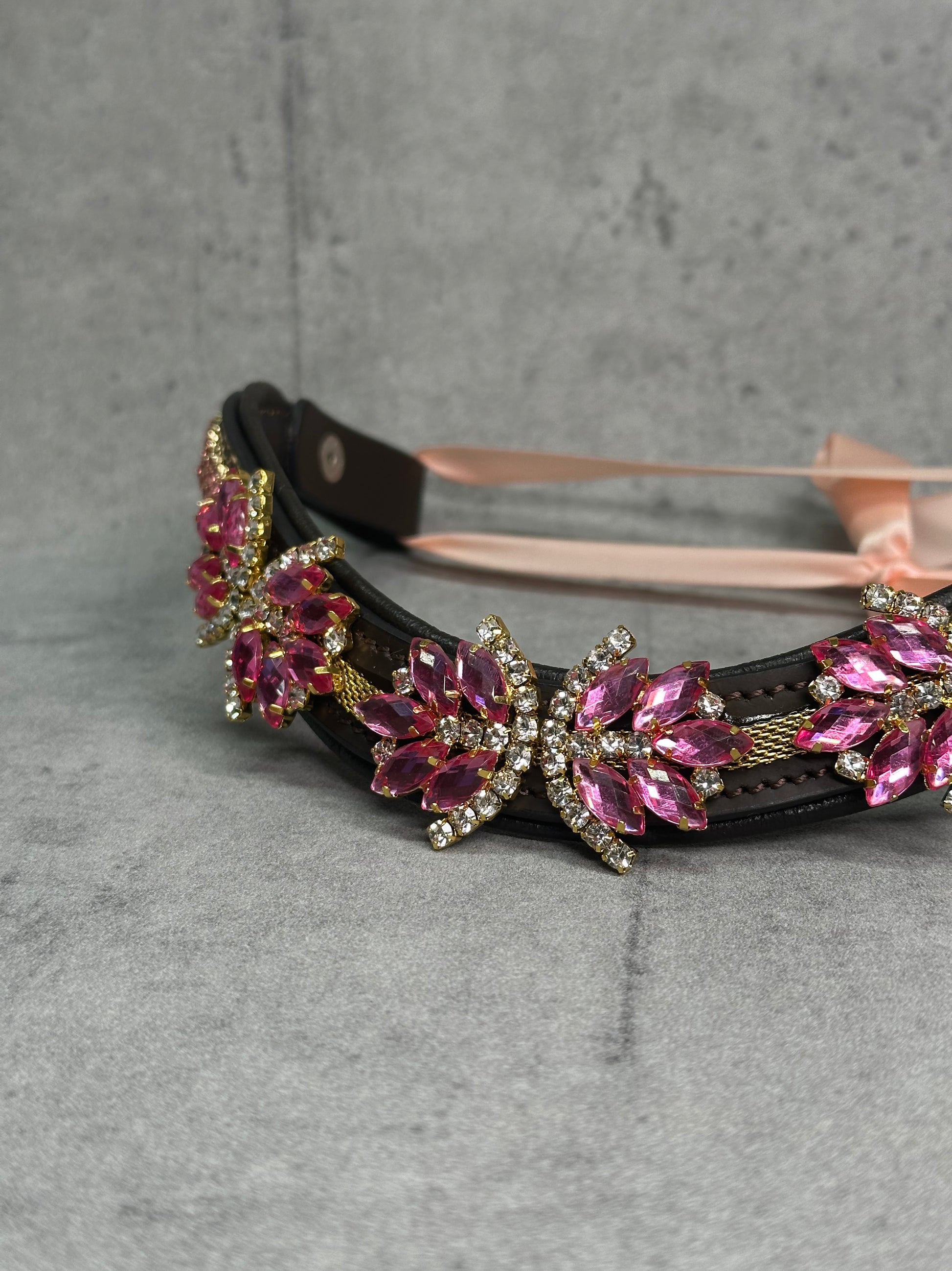 Mit unserem "Popstar" Stirnriemen in Pink mit goldenen und silbernen Details wird jedes Pferd zum absoluten Hingucker. Die pinke Strasssteinverzierung auf dem braunen Lederband und der praktische Schnellverschluss machen nicht nur optisch, sondern auch beim Anlegen eine tolle Figur. Dein Pferd wird bewundernswert aussehen!