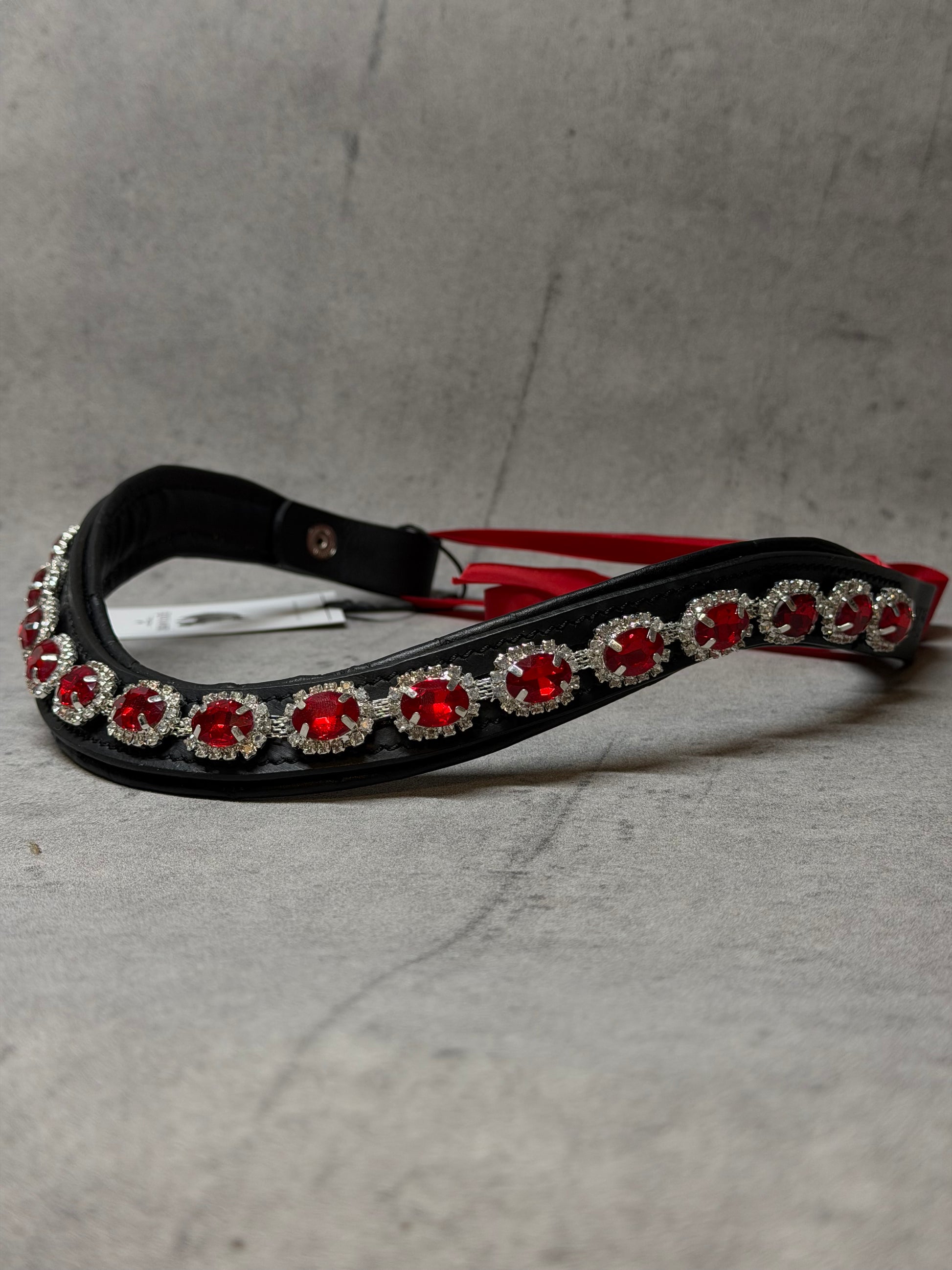 Der Stirnriemen Rouge Noir bringt mit seinen funkelnden roten-Strasssteinen und dem edlen Lederband frischen Glanz in jeden Pferdestall. Dank des cleveren Schnellverschlusses sitzt er nicht nur sicher, sondern lässt sich auch im Handumdrehen anlegen. Erhältlich in den Größen WB (41 cm), COB (38 cm) und Pony (35 cm) – das perfekte Schmuckstück für alle, die ihrem Pferd einen stilvollen und luxuriösen Auftritt gönnen wollen!