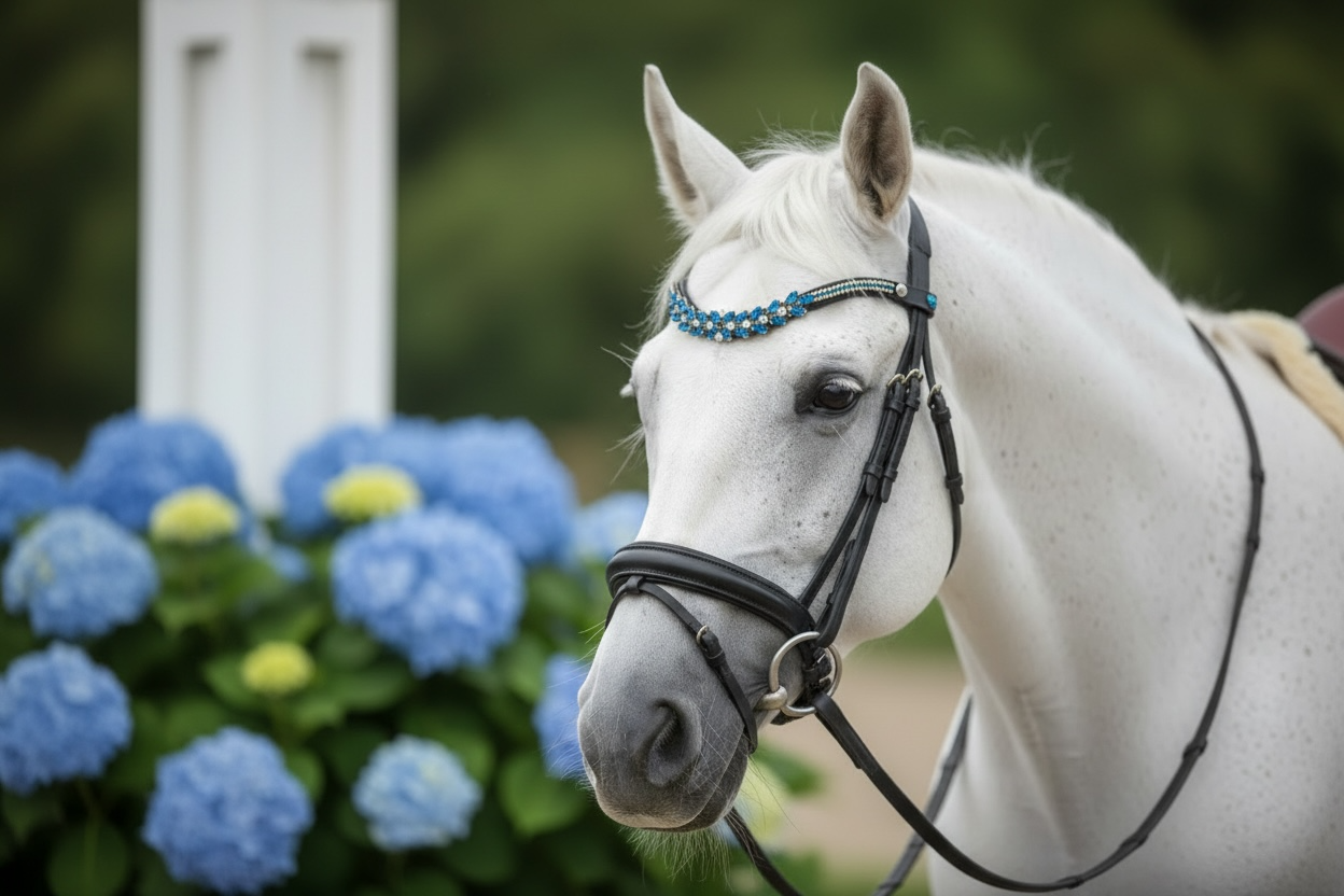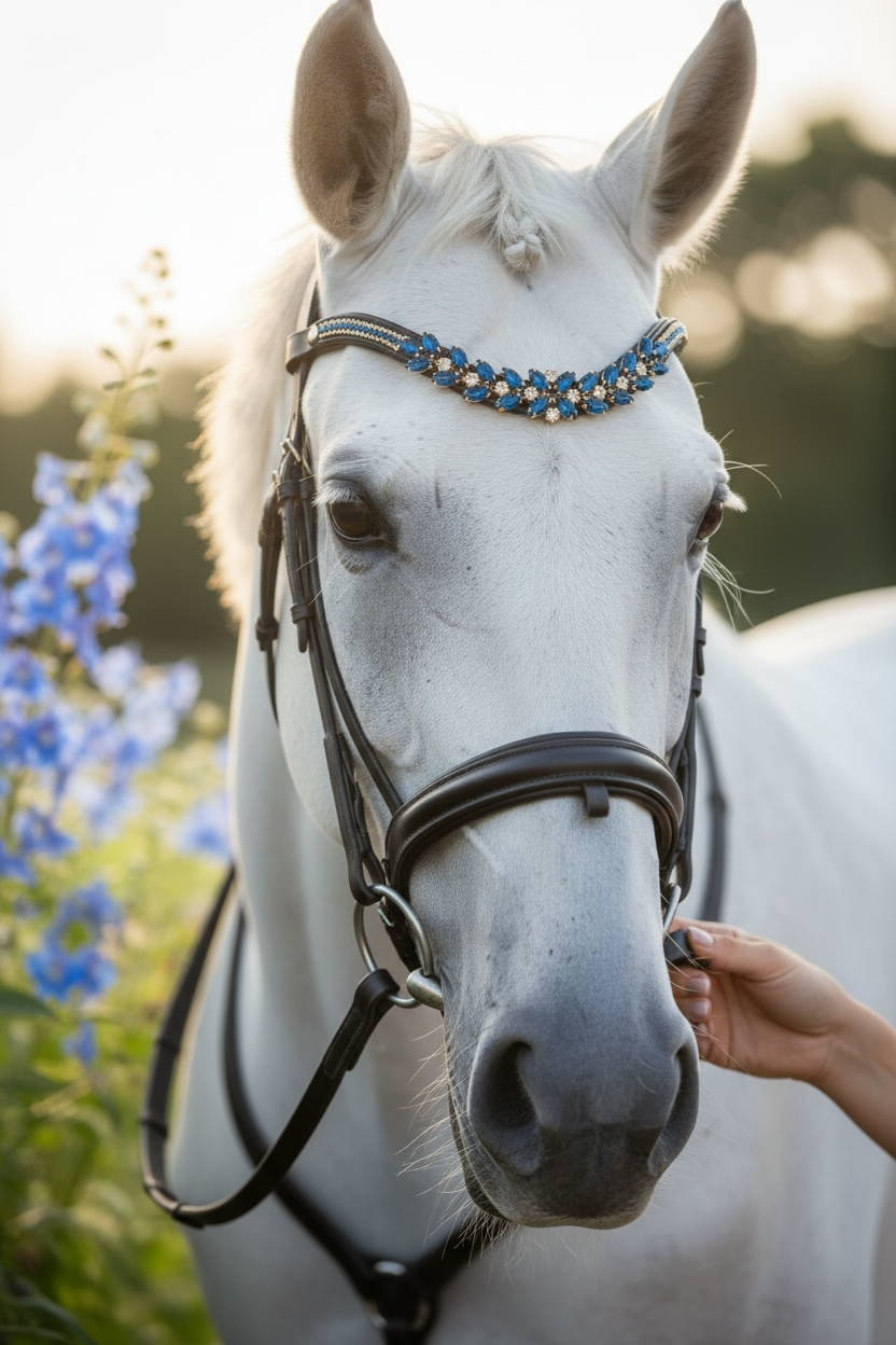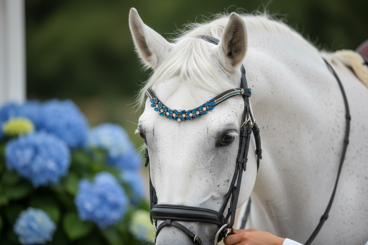 Entdecken Sie den bezaubernden Stirnriemen Saint Marlo in elegantem Champagner mit silbernen Akzenten! Dieses stilvolle Accessoire bringt nicht nur Glanz in Ihr Outfit, sondern lässt sich perfekt mit passendem Sattelschmuck kombinieren. Vervollständigen Sie Ihren Look und fühlen Sie sich auf dem Pferd selbstbewusst und einzigartig!