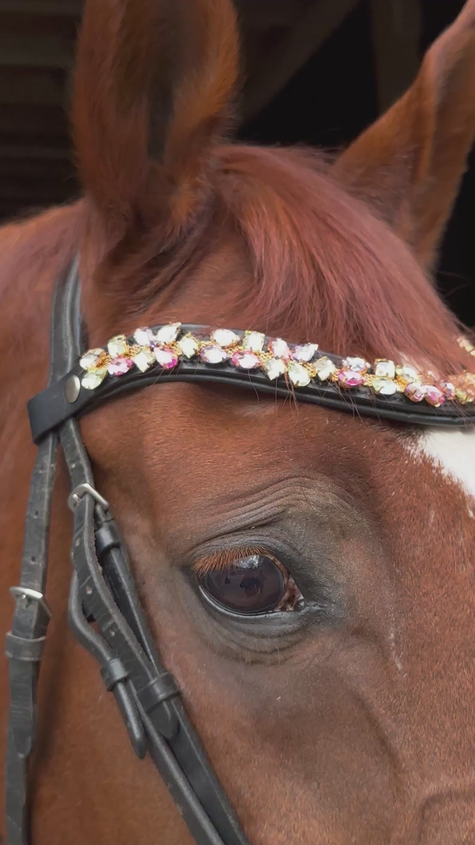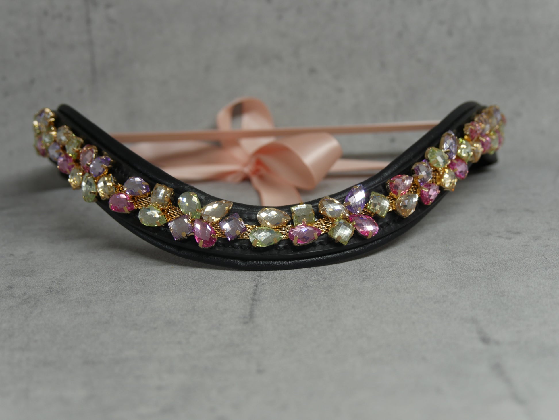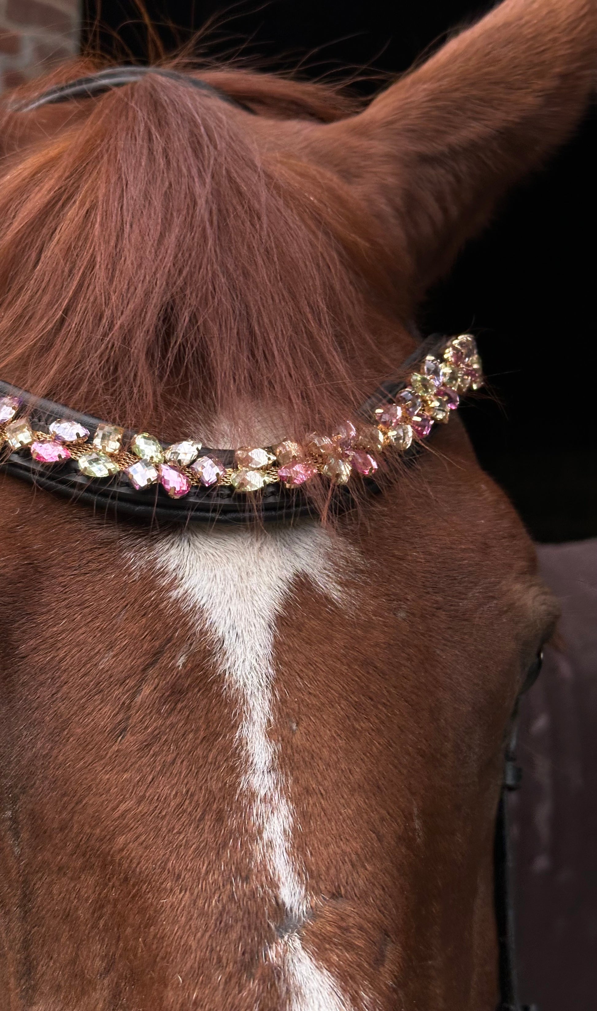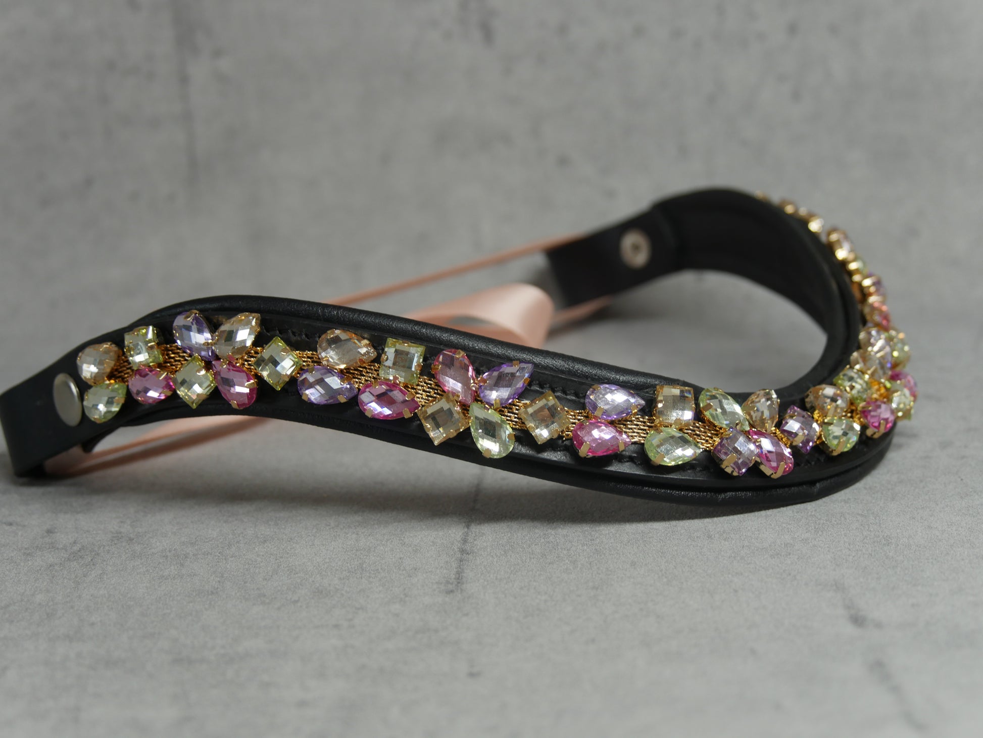 Der Stirnriemen Showtime vereint luxuriöse Eleganz mit funkelnden bunten Strasssteinen auf einem hochwertigen Lederband. Dank des praktischen Schnellverschlusses lässt er sich mühelos anlegen und garantiert einen sicheren, bequemen Sitz – das perfekte Accessoire für stilbewusste Pferdefreunde.