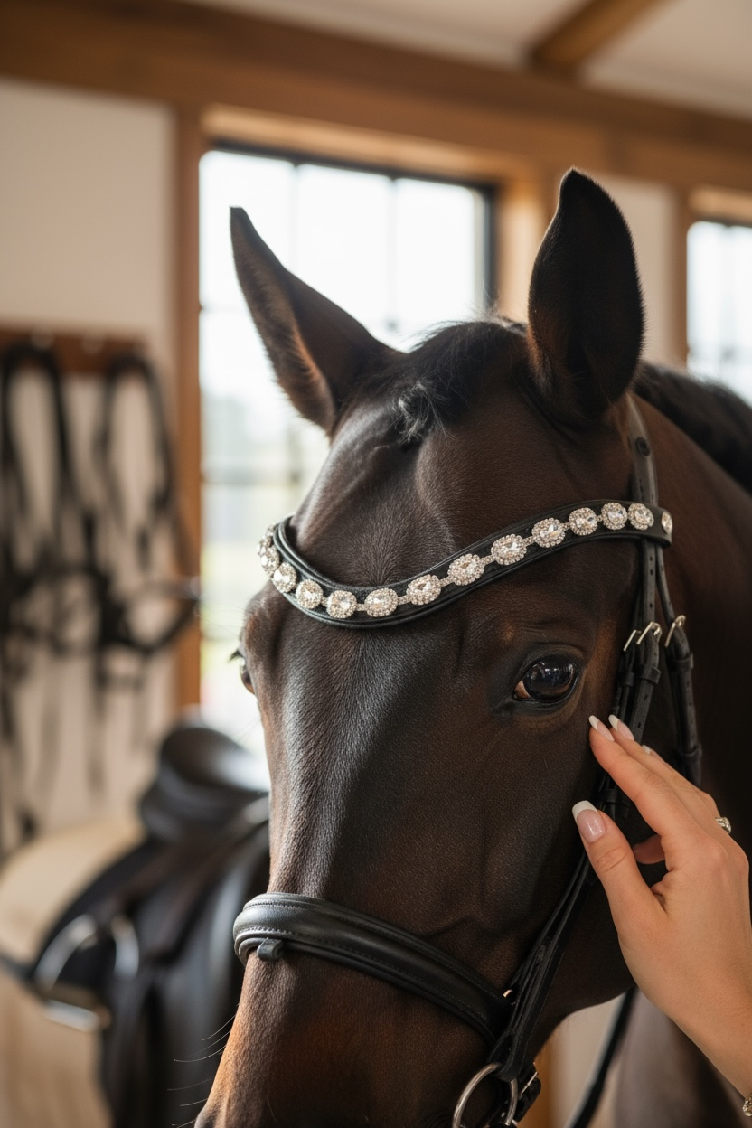 Der Stirnriemen Silver Bubble bringt mit seinen funkelnden Strasssteinen und dem edlen Lederband frischen Glanz in jeden Pferdestall. Dank des cleveren Schnellverschlusses sitzt er nicht nur sicher, sondern lässt sich auch im Handumdrehen anlegen. Erhältlich in den Größen Kaltblut 48cm, WB (41 cm), COB (38 cm) und Pony (35 cm) – das perfekte Schmuckstück für alle, die ihrem Pferd einen stilvollen und luxuriösen Auftritt gönnen wollen!