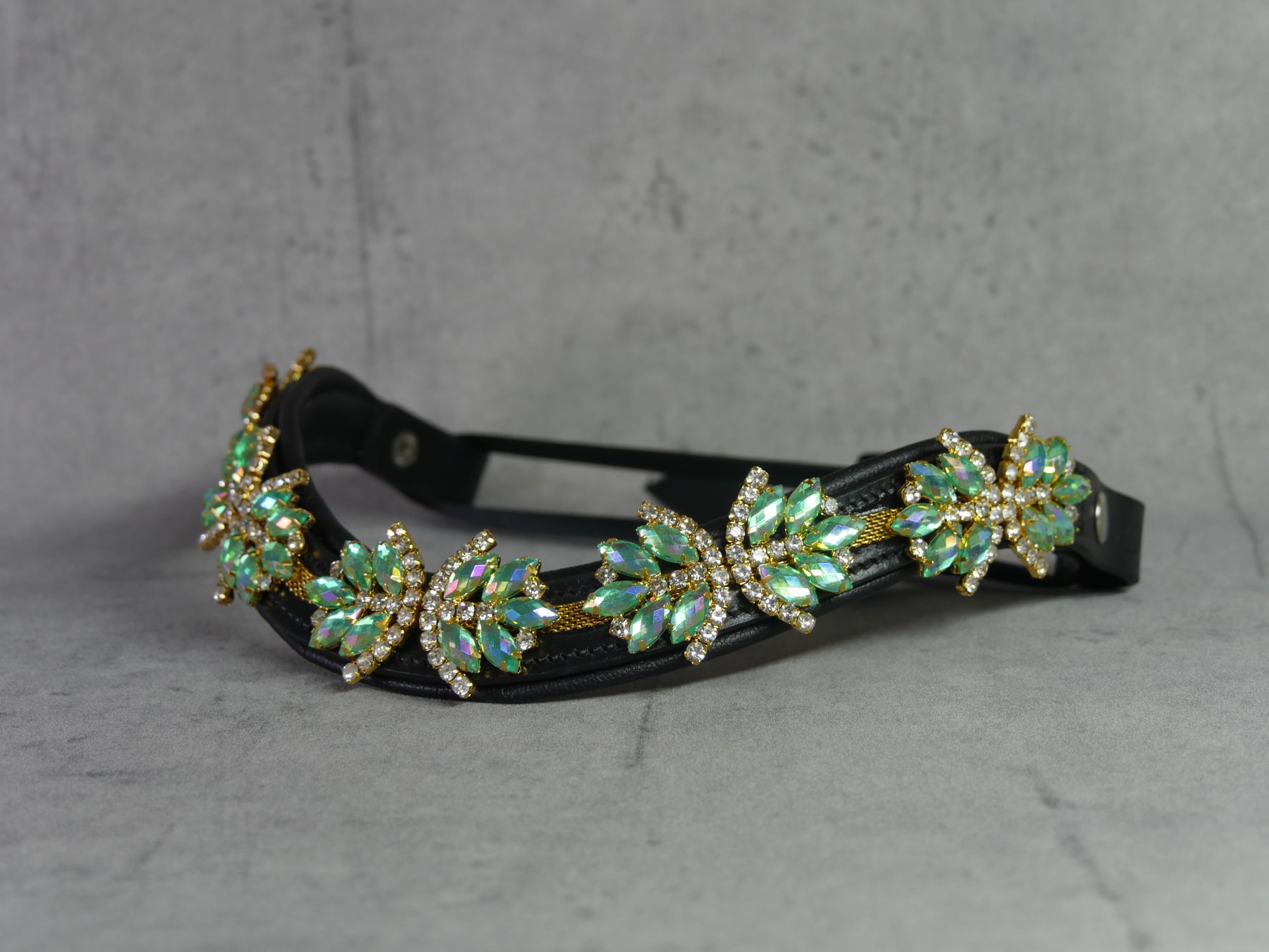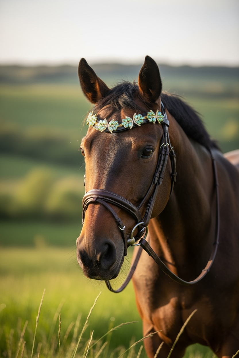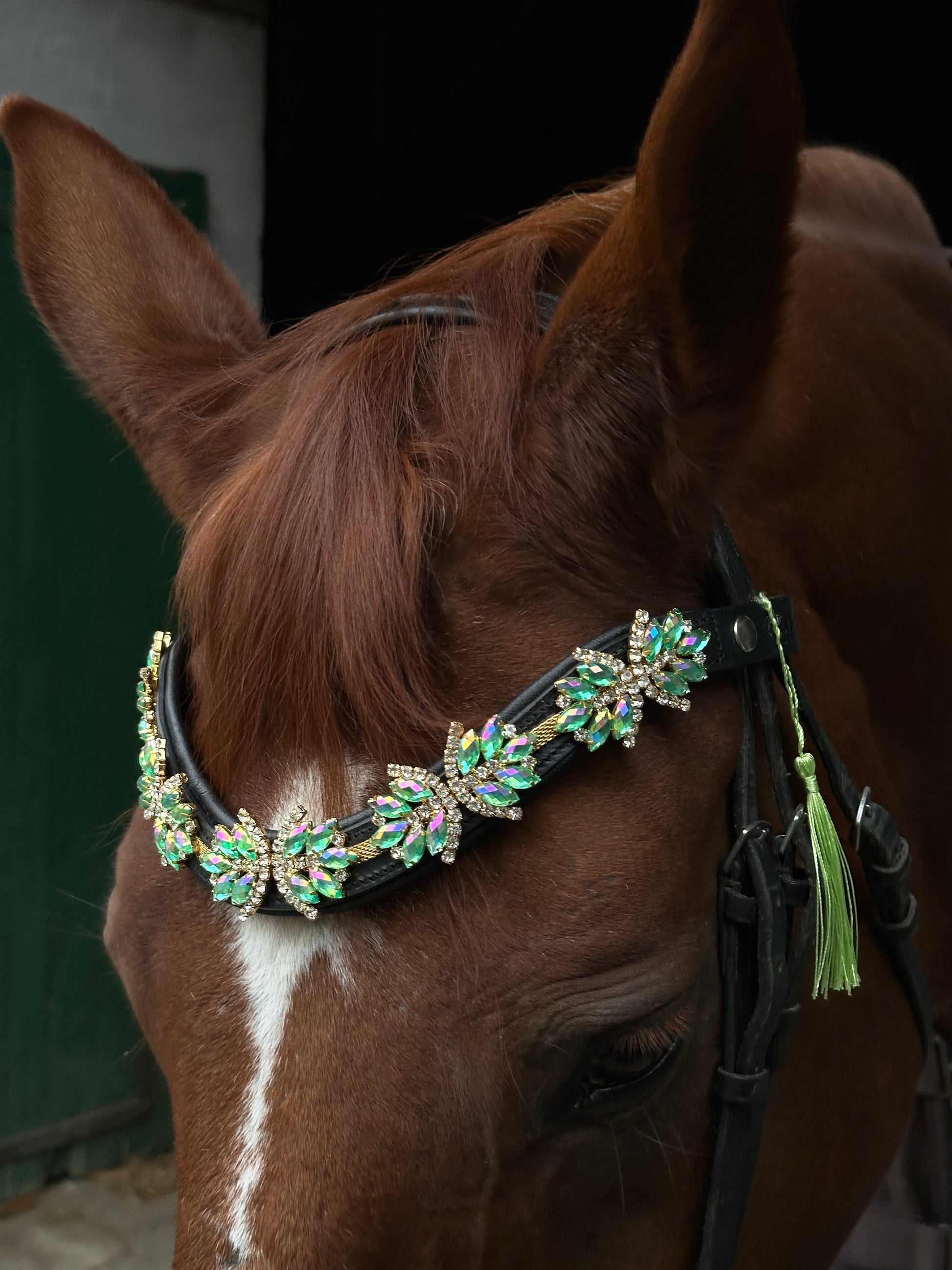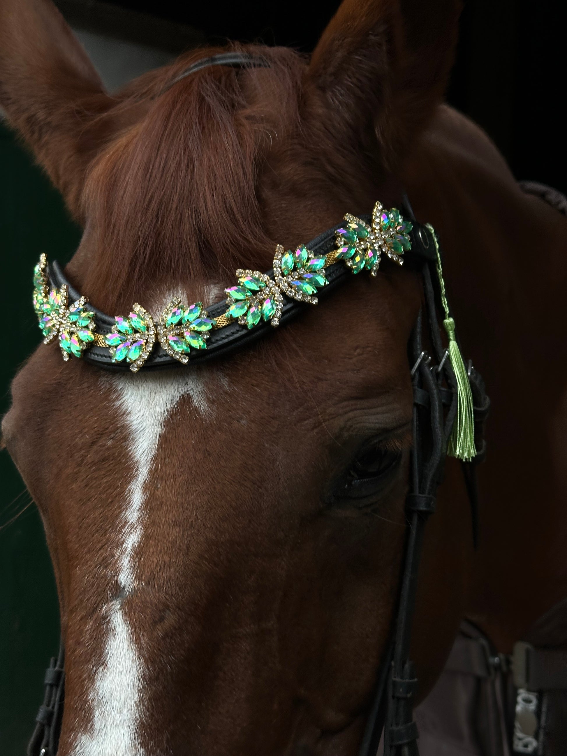 Mit unserem "Superstar" Stirnriemen in Türkis mit goldenen und silbernen Details wird jedes Pferd zum absoluten Hingucker. Die türkise Strasssteinverzierung auf dem schwarzen Lederband und der praktische Schnellverschluss machen nicht nur optisch, sondern auch beim Anlegen eine tolle Figur. Dein Pferd wird bewundernswert aussehen!