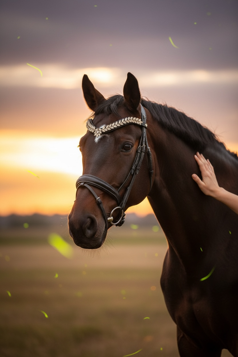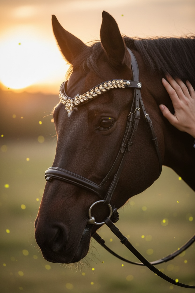 Verleihen Sie Ihrem Pferd einen glamourösen Auftritt mit unserem Stirnriemen "Crown of the sun" mit braunem Leder. Die funkelnden Glitzerelemente setzen bezaubernde Akzente, während der praktische Schnellverschluss für mühelose Handhabung sorgt. Ein unverzichtbares Accessoire für stilbewusste Reiter, die Wert auf Eleganz und Funktionalität legen.