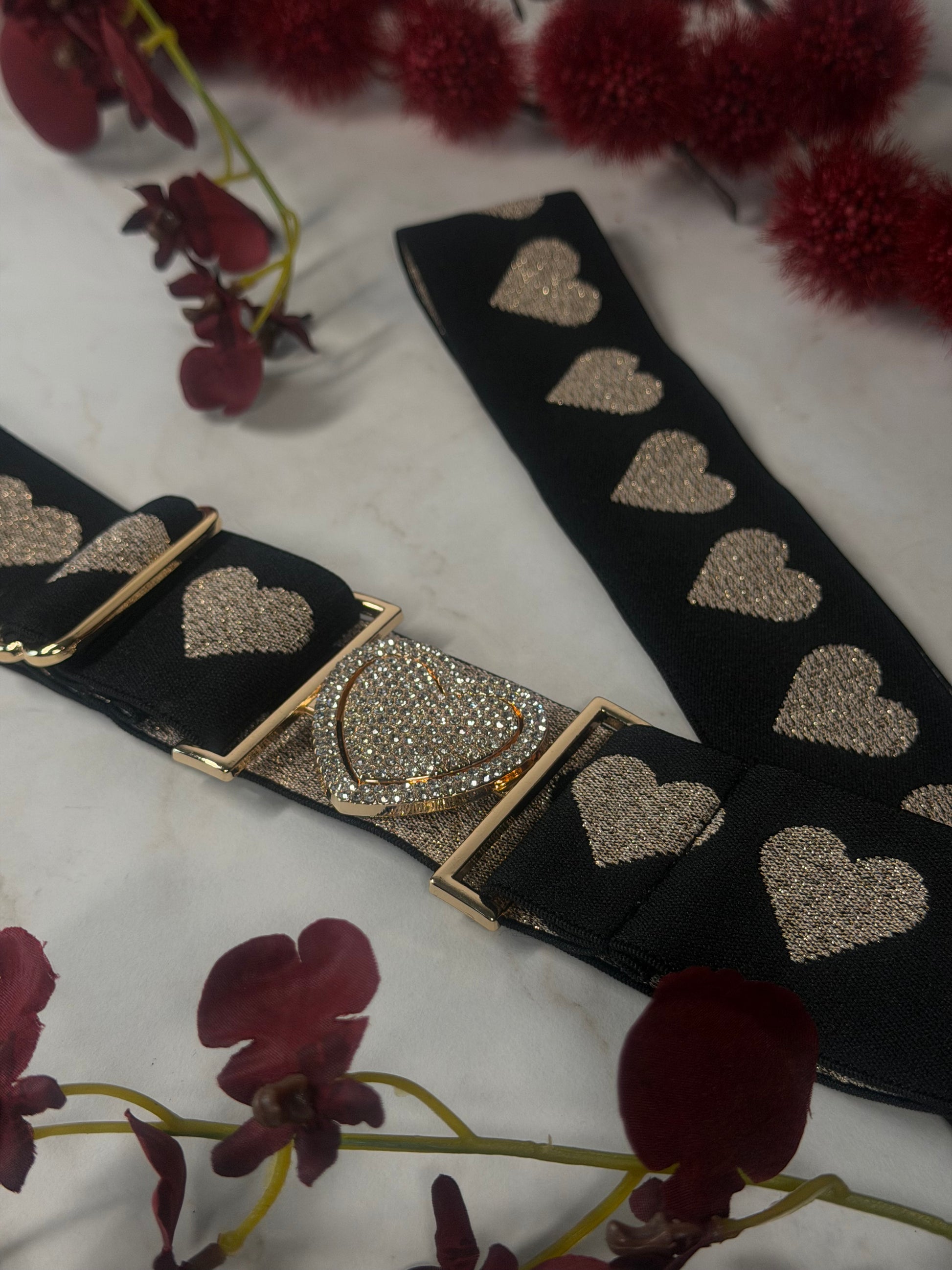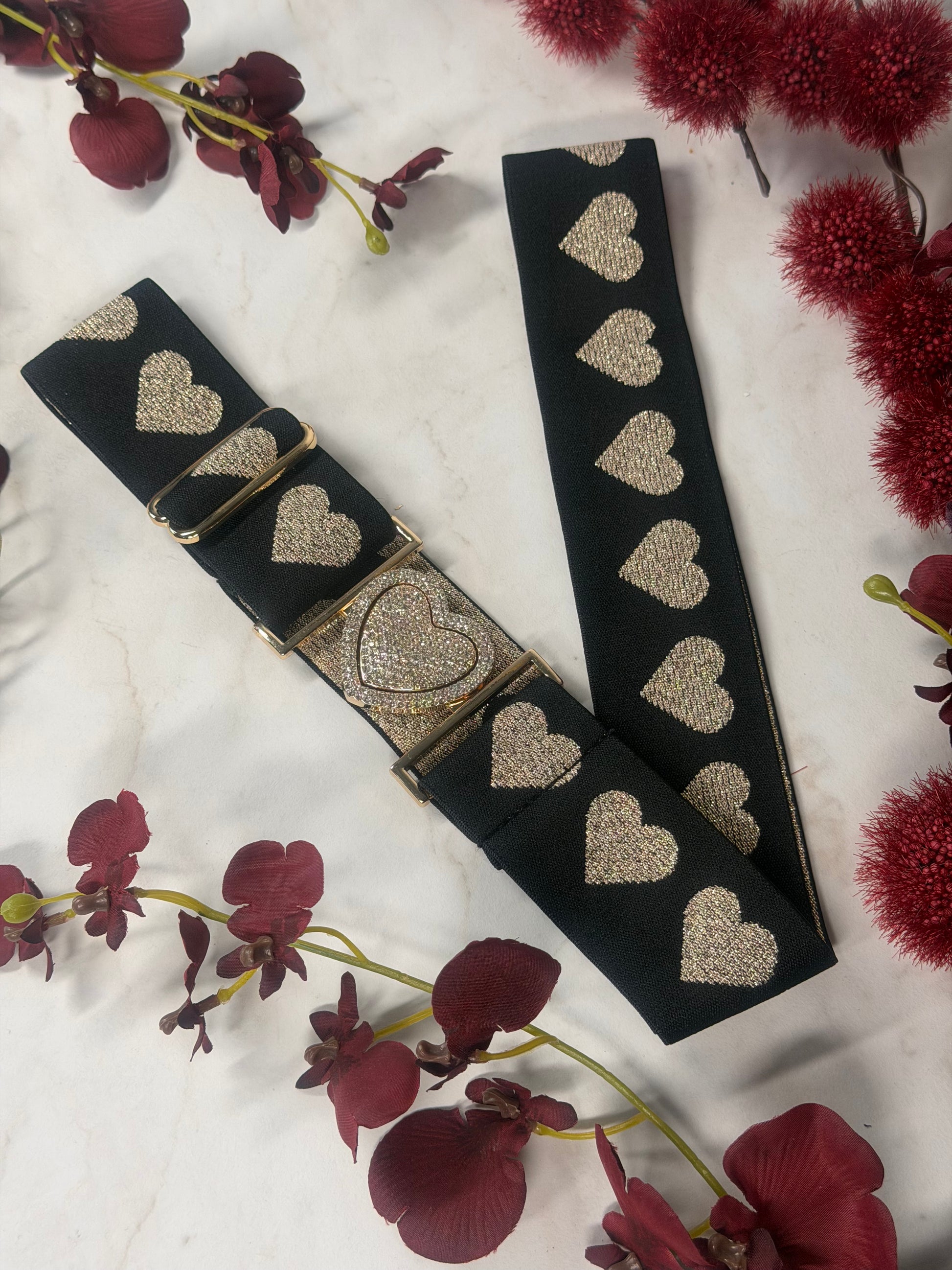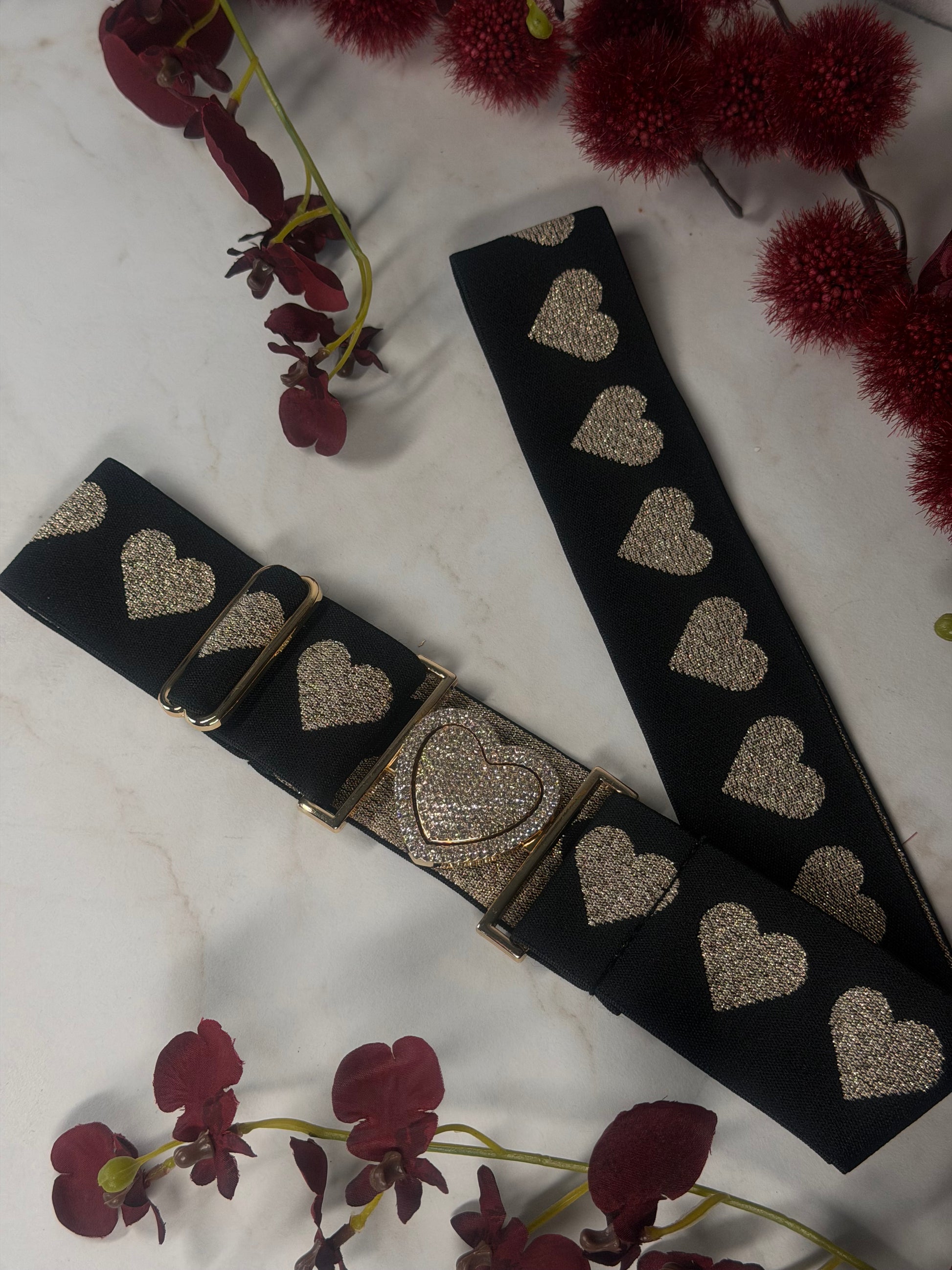 Funkelnder Gürtel mit verspieltem Charme – perfekt für jeden Look, der ein bisschen Extra-Glanz verdient. Das schwarze Glitzer-Design wird durch goldene Herzen und eine bezaubernde Herz-Schnalle zum absoluten Hingucker. Die elastische Verarbeitung mit Elastan sorgt für angenehmen Tragekomfort und passt sich deiner Figur an. Ein Statement-Piece, das dein Outfit im Handumdrehen aufpeppt und deine Liebe zum Detail zeigt.