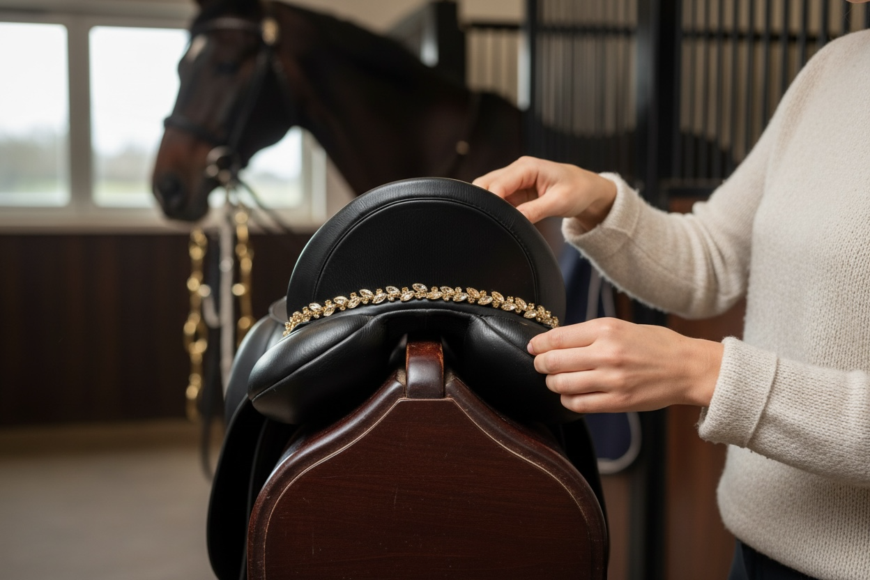 - Sattelschmuck um den hinteren Teil des Sattels führen